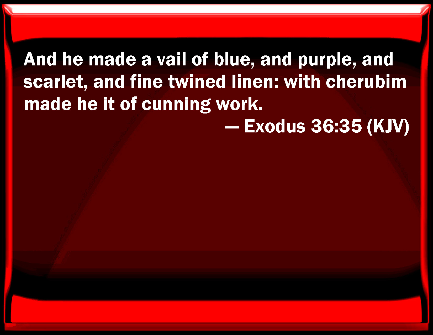Bible Verse Slide Exodus 36:35 And he made a veil of blue, and purple, and scarlet, and fine twined linen: with cherubim made he it of cunning work. KJV: And he made a vail of blue, and purple, and scarlet, and fine twined linen: with cherubims made he it of cunning work. DRB: He made also a veil of violet, and purple, scarlet, and fine twisted linen, varied and distinguished with embroidery: DBT: And he made the veil of blue, and purple, and scarlet, and twined byssus: of artistic work he made it with cherubim. ERV: And he made the veil of blue, and purple, and scarlet, and fine twined linen: with cherubim the work of the cunning workman made he it. WBT: And he made a vail of blue, and purple, and scarlet, and fine twined linen: with cherubim he made it of curious work. WEB: He made the veil of blue, purple, scarlet, and fine twined linen: with cherubim. He made it the work of a skillful workman. YLT: And he maketh the vail of blue, and purple, and scarlet, and twined linen, work of a designer he hath made it, with cherubs;Links Exodus 36:35 NIV • Exodus 36:35 NLT • Exodus 36:35 ESV • Exodus 36:35 NASB • Exodus 36:35 KJV • Exodus 36:35 Interlinear • Exodus 36:35 Commentaries • Exodus 36:35 Parallel Texts • Exodus 36:35 Bible Apps • Exodus 36:35 Parallel • Bible Hub |
