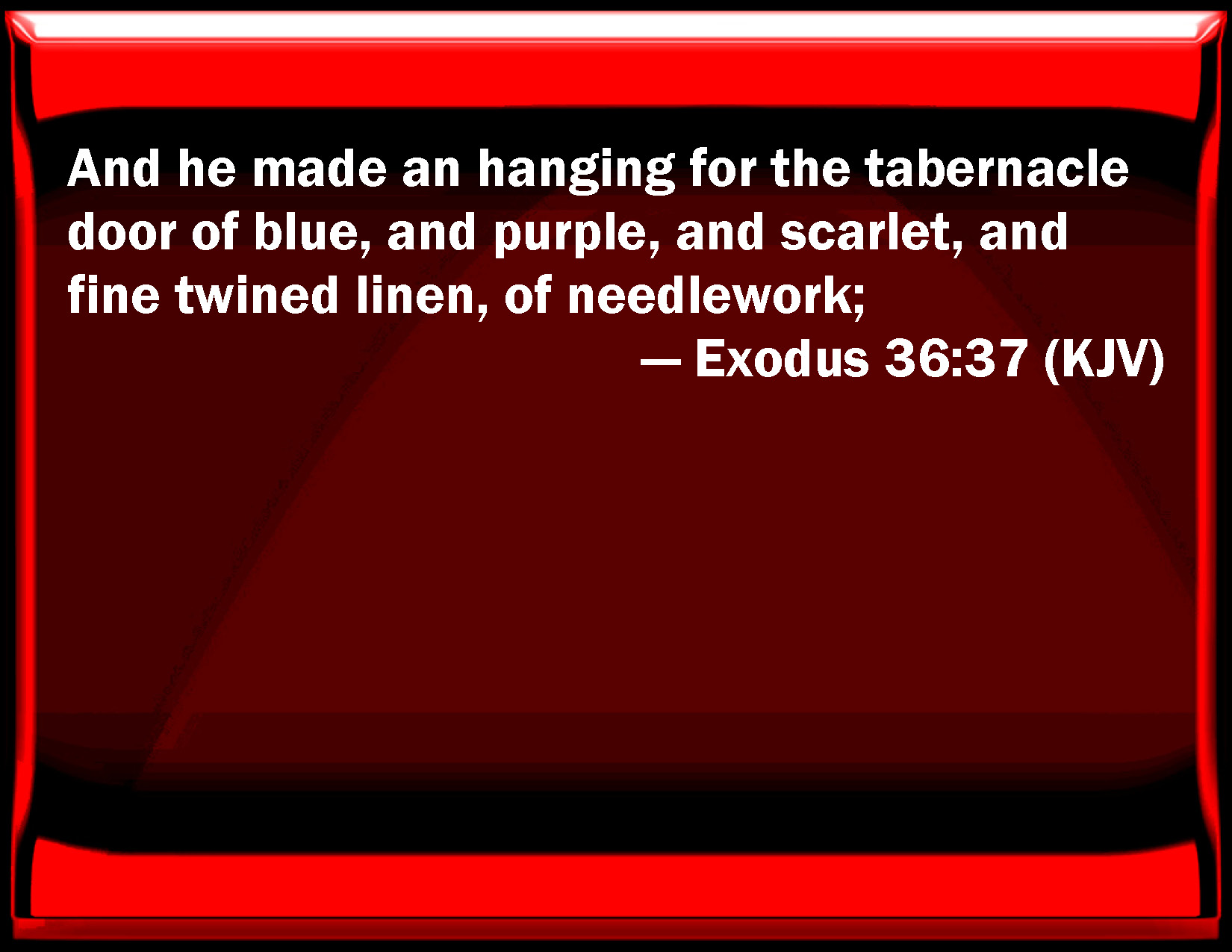 Bible Verse Slide Exodus 36:37 And he made an hanging for the tabernacle door of blue, and purple, and scarlet, and fine twined linen, of needlework; KJV: And he made an hanging for the tabernacle door of blue, and purple, and scarlet, and fine twined linen, of needlework; DRB: He made also a hanging in the entry of the tabernacle of violet, purple, scarlet, and fine twisted linen, with the work of an embroiderer. DBT: And he made a curtain for the entrance of the tent of blue, and purple, and scarlet, and twined byssus, of embroidery; ERV: And he made a screen for the door of the Tent, of blue, and purple, and scarlet, and fine twined linen, the work of the embroiderer; WBT: And he made a hanging for the tabernacle-door of blue, and purple, and scarlet, and fine twined linen, of needle-work; WEB: He made a screen for the door of the tent, of blue, purple, scarlet, and fine twined linen, the work of an embroiderer; YLT: And he maketh a covering for the opening of the tent, of blue, and purple, and scarlet, and twined linen, work of an embroiderer,Links Exodus 36:37 NIV • Exodus 36:37 NLT • Exodus 36:37 ESV • Exodus 36:37 NASB • Exodus 36:37 KJV • Exodus 36:37 Interlinear • Exodus 36:37 Commentaries • Exodus 36:37 Parallel Texts • Exodus 36:37 Bible Apps • Exodus 36:37 Parallel • Bible Hub |