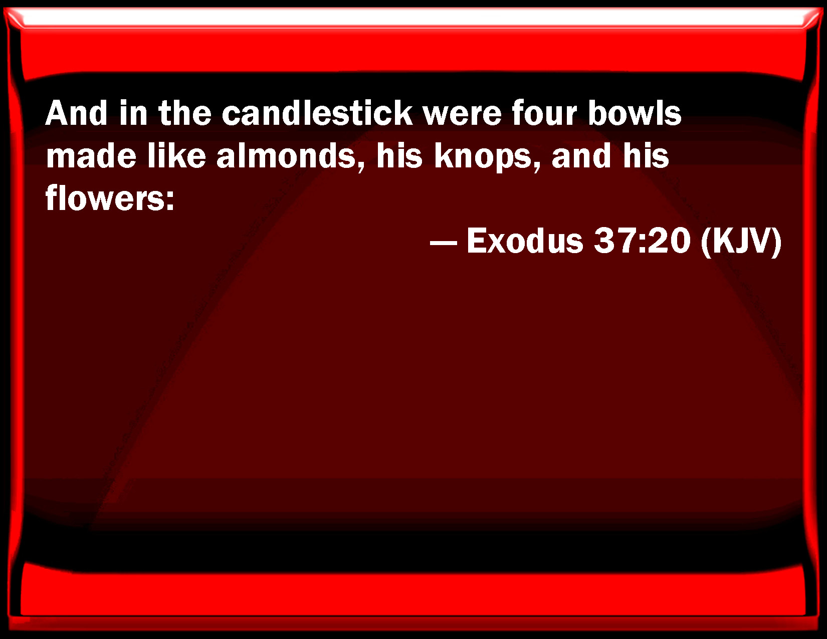 Bible Verse Slide Exodus 37:20 And in the candlestick were four bowls made like almonds, his knops, and his flowers: KJV: And in the candlestick were four bowls made like almonds, his knops, and his flowers: DRB: And in the shaft itself were four cups after the manner of a nut, and bowls withal at every one, and lilies: DBT: And in the candlestick were four cups, shaped like almonds, its knobs, and its flowers; ERV: And in the candlestick were four cups made like almond-blossoms, the knops thereof, and the flowers thereof: WBT: And in the candlestick were four bowls made like almonds, its knobs, and its flowers: WEB: In the lampstand were four cups made like almond blossoms, its buds and its flowers; YLT: And in the candlestick are four calyxes, made like almonds, its knops, and its flowers,Links Exodus 37:20 NIV • Exodus 37:20 NLT • Exodus 37:20 ESV • Exodus 37:20 NASB • Exodus 37:20 KJV • Exodus 37:20 Interlinear • Exodus 37:20 Commentaries • Exodus 37:20 Parallel Texts • Exodus 37:20 Bible Apps • Exodus 37:20 Parallel • Bible Hub |
