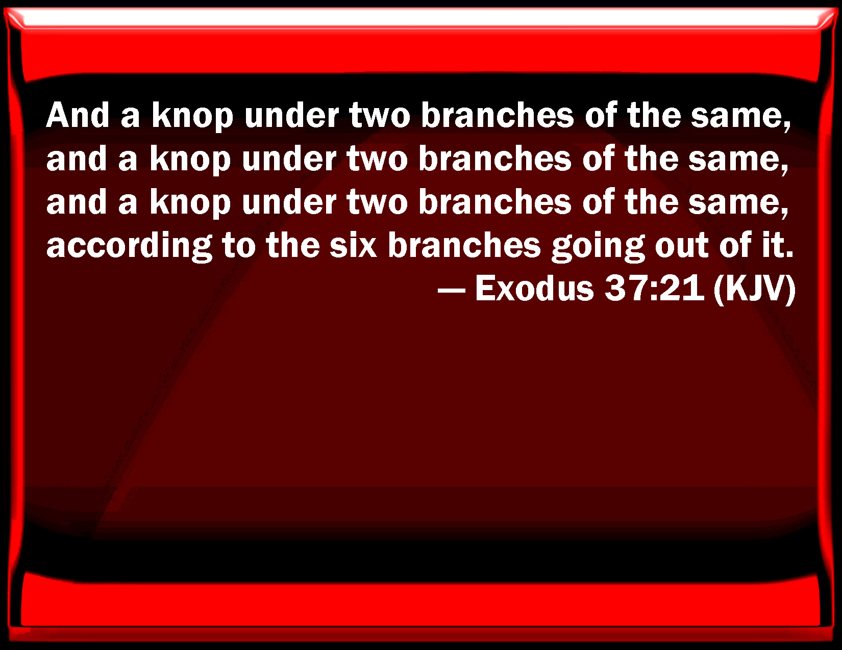 Bible Verse Slide Exodus 37:21 And a bud under two branches of the same, and a bud under two branches of the same, and a bud under two branches of the same, according to the six branches going out of it. KJV: And a knop under two branches of the same, and a knop under two branches of the same, and a knop under two branches of the same, according to the six branches going out of it. DRB: And bowls under two branches in three places, which together make six branches going out from one shaft. DBT: and a knob under two branches thereof, and again a knob under two branches thereof, and again a knob under two branches thereof, for the six branches which went out of it. ERV: and a knop under two branches of one piece with it, and a knop under two branches of one piece with it, and a knop under two branches of one piece with it, for the six branches going out of it. WBT: And a knob under two branches of the same, and a knob under two branches of the same, and a knob under two branches of the same, according to the six branches proceeding from it. WEB: and a bud under two branches of one piece with it, and a bud under two branches of one piece with it, and a bud under two branches of one piece with it, for the six branches going out of it. YLT: and a knop under the two branches of the same, and a knop under the two branches of the same, and a knop under the two branches of the same, are to the six branches which are coming out of it;Links Exodus 37:21 NIV • Exodus 37:21 NLT • Exodus 37:21 ESV • Exodus 37:21 NASB • Exodus 37:21 KJV • Exodus 37:21 Interlinear • Exodus 37:21 Commentaries • Exodus 37:21 Parallel Texts • Exodus 37:21 Bible Apps • Exodus 37:21 Parallel • Bible Hub |