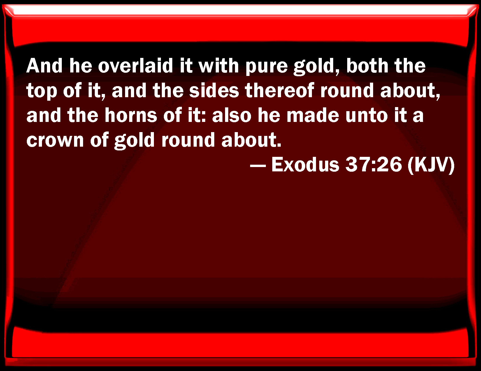Bible Verse Slide Exodus 37:26 And he overlaid it with pure gold, both the top of it, and the sides thereof round about, and the horns of it: also he made to it a crown of gold round about. KJV: And he overlaid it with pure gold, both the top of it, and the sides thereof round about, and the horns of it: also he made unto it a crown of gold round about. DRB: And he overlaid it with the purest gold, with its grate and the sides, and the horns. DBT: And he overlaid it with pure gold, the top thereof, and the sides thereof round about, and the horns thereof; and made upon it a border of gold round about. ERV: And he overlaid it with pure gold, the top thereof, and the sides thereof round about, and the horns of it: and he made unto it a crown of gold round about. WBT: And he overlaid it with pure gold, both the top of it, and its sides round about, and its horns: also he made to it a crown of gold round about. WEB: He overlaid it with pure gold, its top, its sides around it, and its horns. He made a gold molding around it. YLT: and he overlayeth it with pure gold, its top and its sides round about, and its horns; and he maketh for it a wreath of gold round about;Links Exodus 37:26 NIV • Exodus 37:26 NLT • Exodus 37:26 ESV • Exodus 37:26 NASB • Exodus 37:26 KJV • Exodus 37:26 Interlinear • Exodus 37:26 Commentaries • Exodus 37:26 Parallel Texts • Exodus 37:26 Bible Apps • Exodus 37:26 Parallel • Bible Hub |