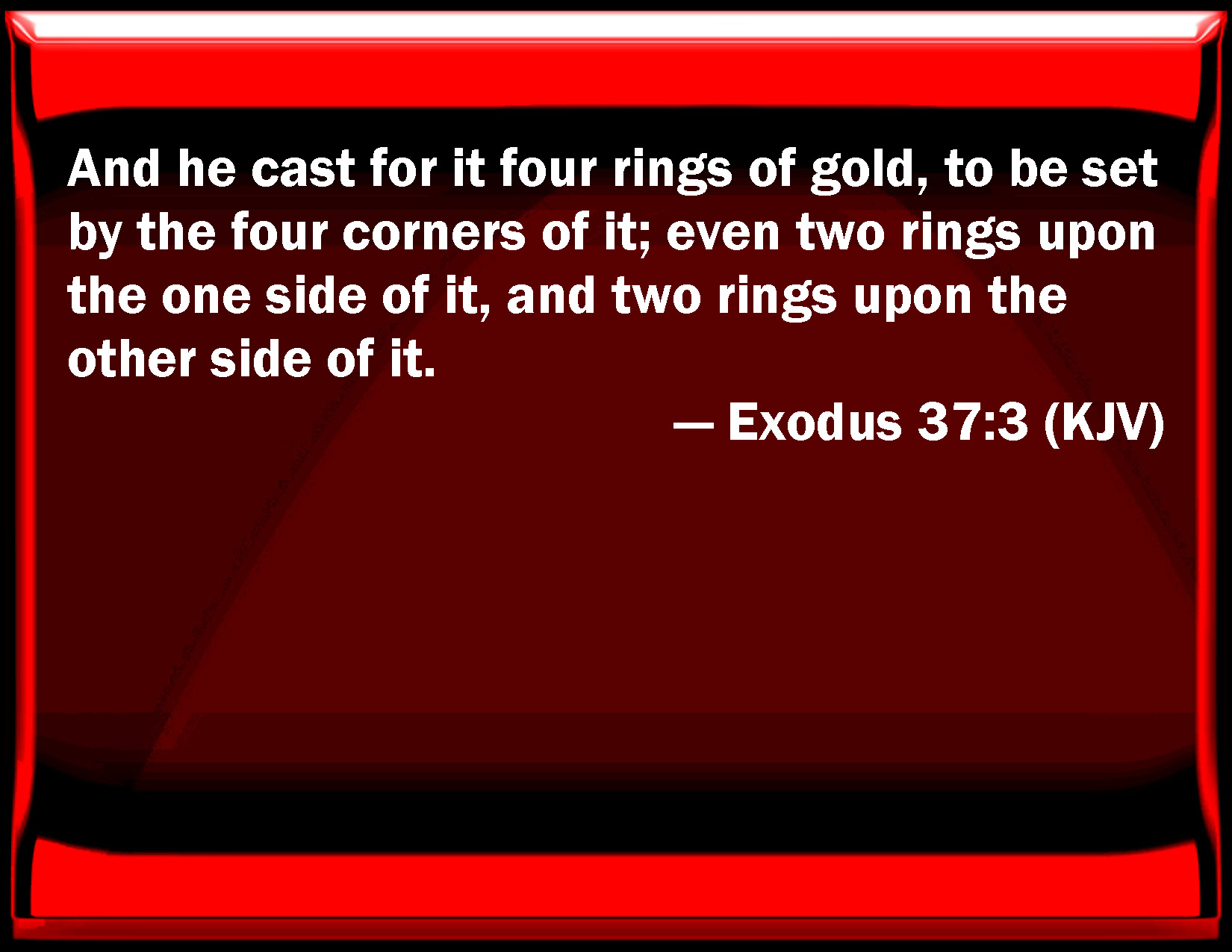 Bible Verse Slide Exodus 37:3 And he cast for it four rings of gold, to be set by the four corners of it; even two rings on the one side of it, and two rings on the other side of it. KJV: And he cast for it four rings of gold, to be set by the four corners of it; even two rings upon the one side of it, and two rings upon the other side of it. DRB: Casting four rings of gold at the four corners thereof: two rings in one side, and two in the other. DBT: And he cast for it four rings of gold, for its four corners: two rings on the one side of it, and two rings on the other side of it. ERV: And he cast for it four rings of gold, in the four feet thereof; even two rings on the one side of it, and two rings on the other side of it. WBT: And he cast for it four rings of gold, to be set by the four corners of it; even two rings upon the one side of it, and two rings upon the other side of it. WEB: He cast four rings of gold for it, in its four feet; even two rings on its one side, and two rings on its other side. YLT: and he casteth for it four rings of gold, on its four feet, even two rings on its one side, and two rings on its second side;Links Exodus 37:3 NIV • Exodus 37:3 NLT • Exodus 37:3 ESV • Exodus 37:3 NASB • Exodus 37:3 KJV • Exodus 37:3 Interlinear • Exodus 37:3 Commentaries • Exodus 37:3 Parallel Texts • Exodus 37:3 Bible Apps • Exodus 37:3 Parallel • Bible Hub |