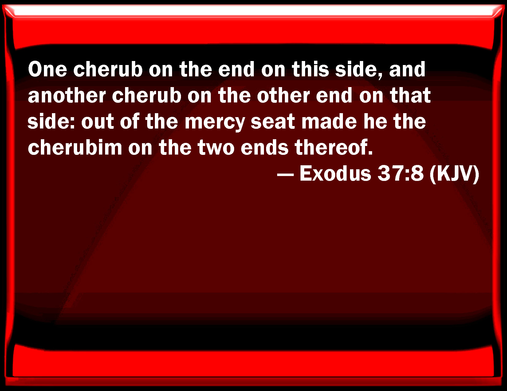 Bible Verse Slide Exodus 37:8 One cherub on the end on this side, and another cherub on the other end on that side: out of the mercy seat made he the cherubim on the two ends thereof. KJV: One cherub on the end on this side, and another cherub on the other end on that side: out of the mercy seat made he the cherubims on the two ends thereof. DRB: One cherub in the top of one side, and the other cherub in the top of the other side: two cherubims at the two ends of the propitiatory, DBT: one cherub at the end of one side, and one cherub at the end of the other side; out of the mercy-seat he made the two cherubim at the two ends thereof. ERV: one cherub at the one end, and one cherub at the other end: of one piece with the mercy-seat made he the cherubim at the two ends thereof. WBT: One cherub on the end on this side, and another cherub on the other end on that side: out of the mercy-seat made he the cherubim on the two ends of it. WEB: one cherub at the one end, and one cherub at the other end. He made the cherubim of one piece with the mercy seat at its two ends. YLT: one cherub at the end on this side, and one cherub at the end on that, out of the mercy-seat he hath made the cherubs, at its two ends;Links Exodus 37:8 NIV • Exodus 37:8 NLT • Exodus 37:8 ESV • Exodus 37:8 NASB • Exodus 37:8 KJV • Exodus 37:8 Interlinear • Exodus 37:8 Commentaries • Exodus 37:8 Parallel Texts • Exodus 37:8 Bible Apps • Exodus 37:8 Parallel • Bible Hub |