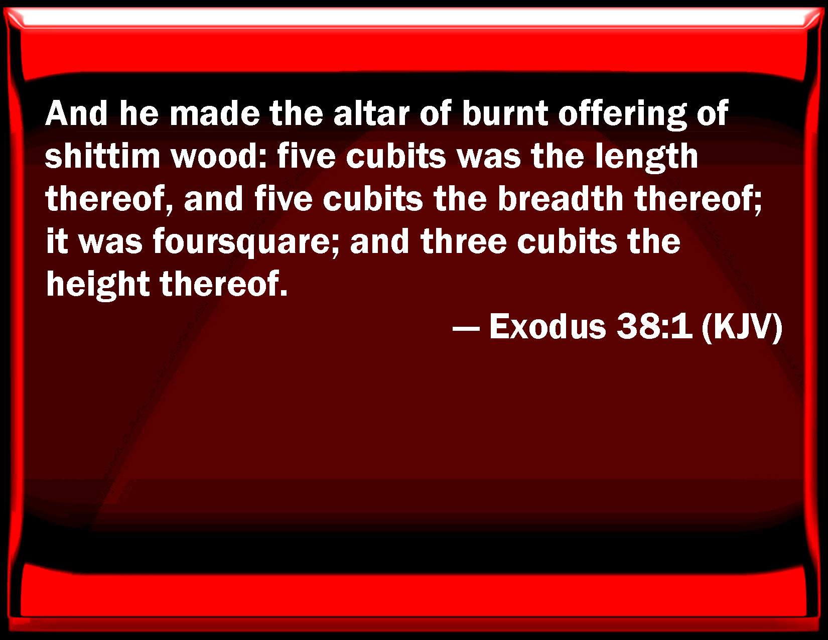Bible Verse Slide Exodus 38:1 And he made the altar of burnt offering of shittim wood: five cubits was the length thereof, and five cubits the breadth thereof; it was foursquare; and three cubits the height thereof. KJV: And he made the altar of burnt offering of shittim wood: five cubits was the length thereof, and five cubits the breadth thereof; it was foursquare; and three cubits the height thereof. DRB: He made also the altar of holocaust of setim wood, five cubits square, and three in height: DBT: And he made the altar of burnt-offering of acacia-wood; five cubits the length thereof, and five cubits the breadth thereof, square, and three cubits the height thereof. ERV: And he made the altar of burnt offering of acacia wood: five cubits was the length thereof, and five cubits the breadth thereof, foursquare; and three cubits the height thereof. WBT: And he made the altar of burnt-offering of shittim wood: five cubits was the length of it, and five cubits the breadth of it; it was foursquare; and its hight was three cubits. WEB: He made the altar of burnt offering of acacia wood. It was square. Its length was five cubits, its breadth was five cubits, and its height was three cubits. YLT: And he maketh the altar of burnt-offering of shittim wood, five cubits its length, and five cubits its breadth (square), and three cubits its height;Links Exodus 38:1 NIV • Exodus 38:1 NLT • Exodus 38:1 ESV • Exodus 38:1 NASB • Exodus 38:1 KJV • Exodus 38:1 Interlinear • Exodus 38:1 Commentaries • Exodus 38:1 Parallel Texts • Exodus 38:1 Bible Apps • Exodus 38:1 Parallel • Bible Hub |