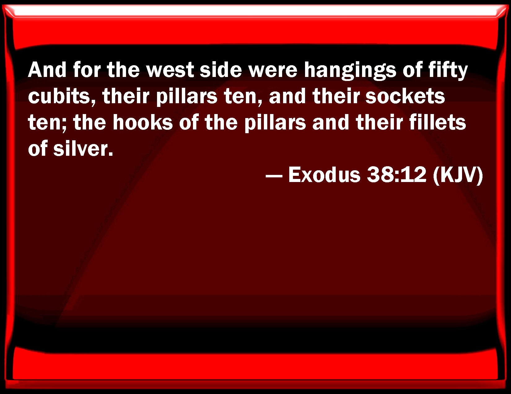 Bible Verse Slide Exodus 38:12 And for the west side were hangings of fifty cubits, their pillars ten, and their sockets ten; the hooks of the pillars and their fillets of silver. KJV: And for the west side were hangings of fifty cubits, their pillars ten, and their sockets ten; the hooks of the pillars and their fillets of silver. DRB: But on that side that looketh to the west, there were hangings of fifty cubits, ten pillars of brass with their sockets, and the heads of the pillars, and all the graving of the work, of silver. DBT: And on the west side, hangings of fifty cubits; their pillars ten, and their bases ten; the hooks of the pillars and their connecting-rods of silver. ERV: And for the west side were hangings of fifty cubits, their pillars ten, and their sockets ten; the hooks of the pillars and their fillets of silver. WBT: And for the west side were hangings of fifty cubits, their pillars ten, and their sockets ten; the hooks of the pillars, and their fillets, of silver. WEB: For the west side were hangings of fifty cubits, their pillars ten, and their sockets ten; the hooks of the pillars, and their fillets, of silver. YLT: and at the west side are hangings, fifty by the cubit; their pillars are ten, and their sockets ten; the pegs of the pillars and their fillets are silver;Links Exodus 38:12 NIV • Exodus 38:12 NLT • Exodus 38:12 ESV • Exodus 38:12 NASB • Exodus 38:12 KJV • Exodus 38:12 Interlinear • Exodus 38:12 Commentaries • Exodus 38:12 Parallel Texts • Exodus 38:12 Bible Apps • Exodus 38:12 Parallel • Bible Hub |
