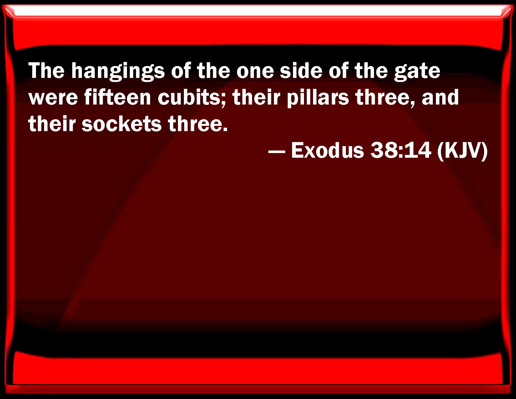 Bible Verse Slide Exodus 38:14 The hangings of the one side of the gate were fifteen cubits; their pillars three, and their sockets three. KJV: The hangings of the one side of the gate were fifteen cubits; their pillars three, and their sockets three. DRB: Fifteen cubits of which were on one side with three pillars, and their sockets: DBT: the hangings on the one wing of fifteen cubits, their pillars three, and their bases three; ERV: The hangings for the one side of the gate were fifteen cubits; their pillars three, and their sockets three; WBT: The hangings of the one side of the gate were fifteen cubits; their pillars three, and their sockets three. WEB: The hangings for the one side were fifteen cubits; their pillars three, and their sockets three; YLT: The hangings on the side are fifteen cubits, their pillars three, and their sockets three,Links Exodus 38:14 NIV • Exodus 38:14 NLT • Exodus 38:14 ESV • Exodus 38:14 NASB • Exodus 38:14 KJV • Exodus 38:14 Interlinear • Exodus 38:14 Commentaries • Exodus 38:14 Parallel Texts • Exodus 38:14 Bible Apps • Exodus 38:14 Parallel • Bible Hub |