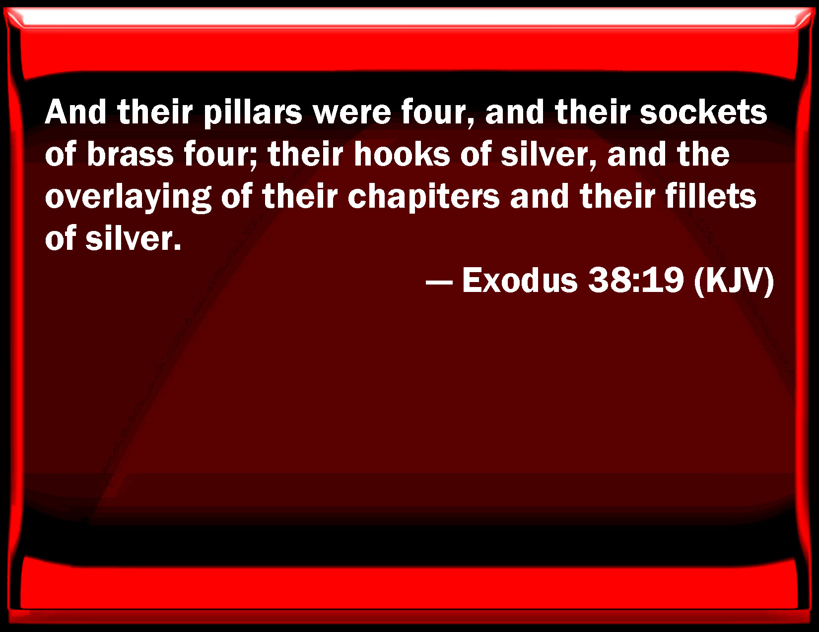 Bible Verse Slide Exodus 38:19 And their pillars were four, and their sockets of brass four; their hooks of silver, and the overlaying of their capitals and their fillets of silver. KJV: And their pillars were four, and their sockets of brass four; their hooks of silver, and the overlaying of their chapiters and their fillets of silver. DRB: And the pillars in the entry were four with sockets of brass, and their heads and gravings of silver. DBT: and their pillars four, and their bases four, of copper; their hooks of silver, and the overlaying of their capitals and their connecting-rods of silver. ERV: And their pillars were four, and their sockets four, of brass; their hooks of silver, and the overlaying of their chapiters and their fillets of silver. WBT: And their pillars were four, and their sockets of brass four; their hooks of silver, and the overlaying of their capitals and their fillets of silver. WEB: Their pillars were four, and their sockets four, of brass; their hooks of silver, and the overlaying of their capitals, and their fillets, of silver. YLT: and their pillars are four, and their sockets of brass four, their pegs are of silver, and the overlaying of their tops and their fillets are of silver;Links Exodus 38:19 NIV • Exodus 38:19 NLT • Exodus 38:19 ESV • Exodus 38:19 NASB • Exodus 38:19 KJV • Exodus 38:19 Interlinear • Exodus 38:19 Commentaries • Exodus 38:19 Parallel Texts • Exodus 38:19 Bible Apps • Exodus 38:19 Parallel • Bible Hub |