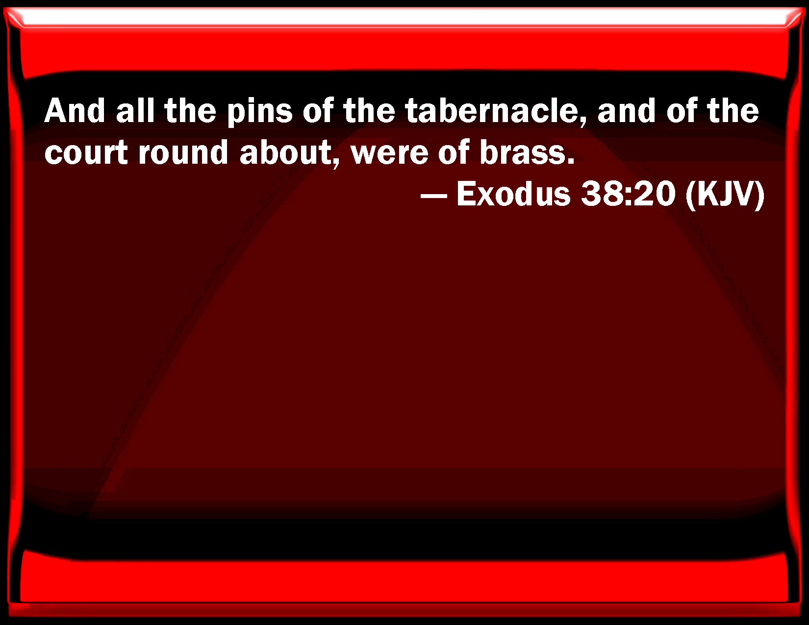 Bible Verse Slide Exodus 38:20 And all the pins of the tabernacle, and of the court round about, were of brass. KJV: And all the pins of the tabernacle, and of the court round about, were of brass. DRB: The pins also of the tabernacle and of the court round about he made of brass. DBT: And all the pegs for the tabernacle and for the court round about were of copper. ERV: And all the pins of the tabernacle, and of the court round about, were of brass. WBT: And all the pins of the tabernacle, and of the court round about, were of brass. WEB: All the pins of the tabernacle, and around the court, were of brass. YLT: and all the pins for the tabernacle, and for the court round about, are of brass.Links Exodus 38:20 NIV • Exodus 38:20 NLT • Exodus 38:20 ESV • Exodus 38:20 NASB • Exodus 38:20 KJV • Exodus 38:20 Interlinear • Exodus 38:20 Commentaries • Exodus 38:20 Parallel Texts • Exodus 38:20 Bible Apps • Exodus 38:20 Parallel • Bible Hub |