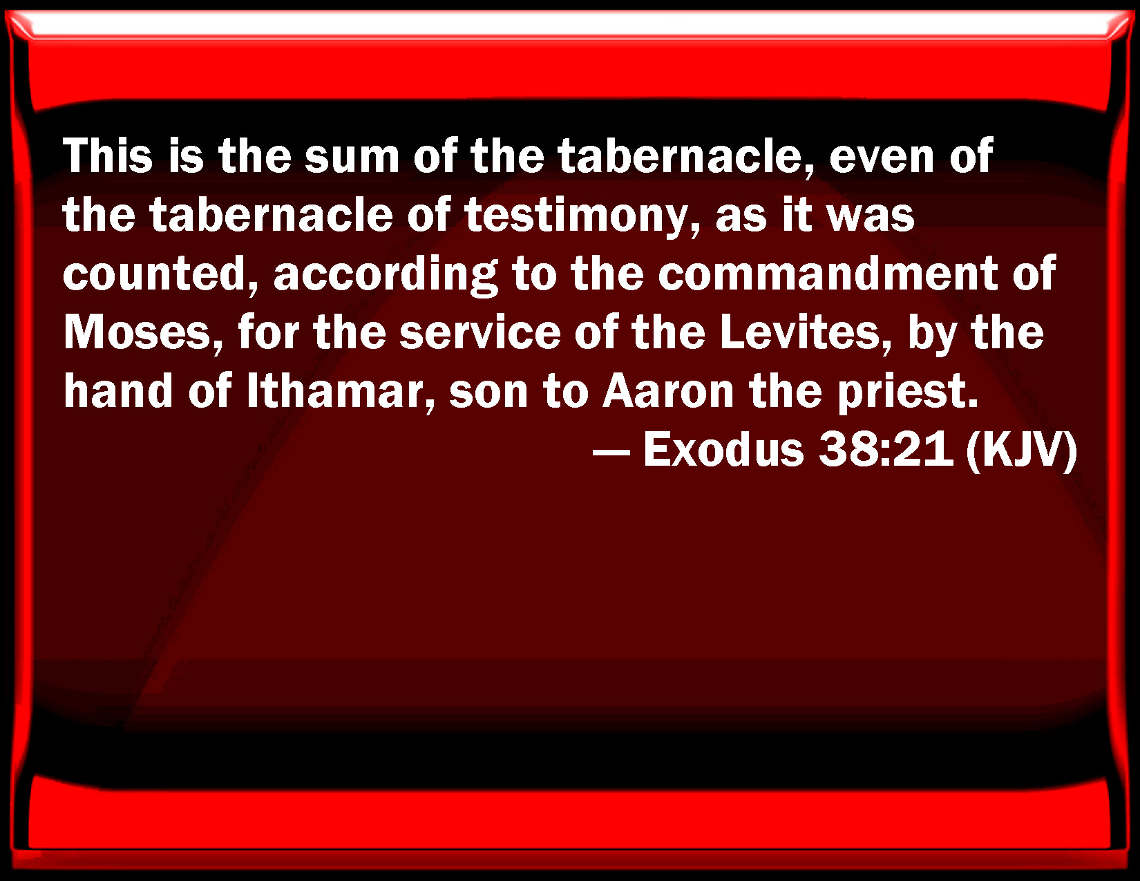 Bible Verse Slide Exodus 38:21 This is the sum of the tabernacle, even of the tabernacle of testimony, as it was counted, according to the commandment of Moses, for the service of the Levites, by the hand of Ithamar, son to Aaron the priest. KJV: This is the sum of the tabernacle, even of the tabernacle of testimony, as it was counted, according to the commandment of Moses, for the service of the Levites, by the hand of Ithamar, son to Aaron the priest. DRB: These are the instruments of the tabernacle of the testimony, which were counted according to the commandment of Moses, in the ceremonies of the Levites, by the hand of Ithamar son of Aaron the priest: DBT: These are the things numbered of the tabernacle, the tabernacle of the testimony, which were counted, according to the commandment of Moses, by the service of the Levites, under the hand of Ithamar, son of Aaron the priest. ERV: This is the sum of the things for the tabernacle, even the tabernacle of the testimony, as they were counted, according to the commandment of Moses, for the service of the Levites, by the hand of Ithamar, the son of Aaron the priest. WBT: This is the sum of the tabernacle, even of the tabernacle of testimony, as it was counted, according to the commandment of Moses, for the service of the Levites, by the hand of Ithamar, son to Aaron the priest. WEB: This is the amount of material used for the tabernacle, even the Tabernacle of the Testimony, as they were counted, according to the commandment of Moses, for the service of the Levites, by the hand of Ithamar, the son of Aaron the priest. YLT: These are the numberings of the tabernacle (the tabernacle of testimony), which hath been numbered by the command of Moses, the service of the Levites, by the hand of Ithamar son of Aaron the priest.Links Exodus 38:21 NIV • Exodus 38:21 NLT • Exodus 38:21 ESV • Exodus 38:21 NASB • Exodus 38:21 KJV • Exodus 38:21 Interlinear • Exodus 38:21 Commentaries • Exodus 38:21 Parallel Texts • Exodus 38:21 Bible Apps • Exodus 38:21 Parallel • Bible Hub |