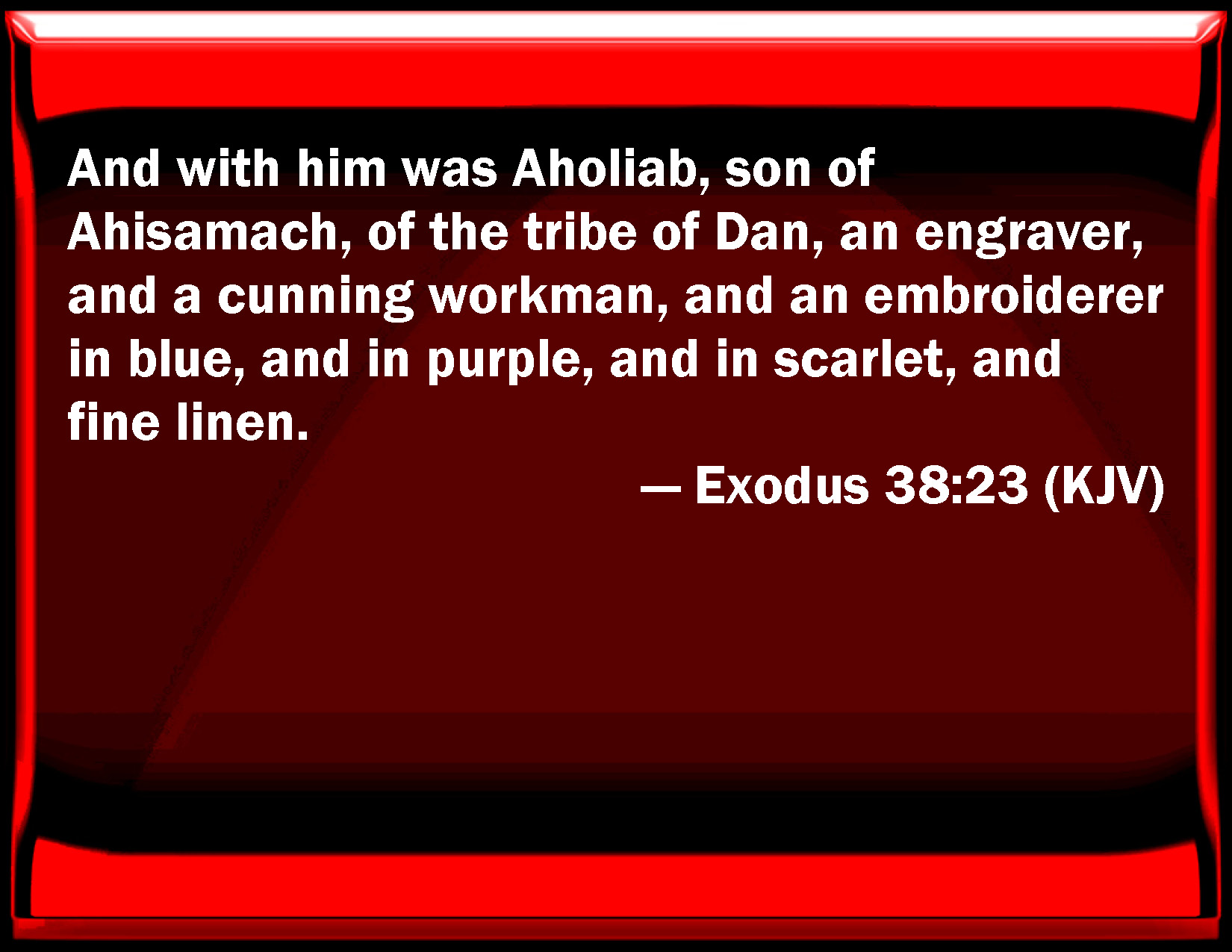Bible Verse Slide Exodus 38:23 And with him was Aholiab, son of Ahisamach, of the tribe of Dan, an engraver, and a cunning workman, and an embroiderer in blue, and in purple, and in scarlet, and fine linen. KJV: And with him was Aholiab, son of Ahisamach, of the tribe of Dan, an engraver, and a cunning workman, and an embroiderer in blue, and in purple, and in scarlet, and fine linen. DRB: Having for his companion Ooliab the son of Achisamech of the tribe of Dan: who also was an excellent artificer in wood, and worker in tapestry and embroidery in violet, purple, scarlet, and fine linen. DBT: and with him Aholiab, son of Ahisamach, of the tribe of Dan, an engraver and artificer, and an embroiderer in blue, and in purple, and in scarlet, and in byssus. ERV: And with him was Oholiab, the son of Ahisamach, of the tribe of Dan, an engraver, and a cunning workman, and an embroiderer in blue, and in purple, and in scarlet, and fine linen. WBT: And with him was Aholiab, son of Ahisamach, of the tribe of Dan, an engraver, and a skillful workman, and an embroiderer in blue, and in purple, and in scarlet, and fine linen. WEB: With him was Oholiab, the son of Ahisamach, of the tribe of Dan, an engraver, and a skillful workman, and an embroiderer in blue, in purple, in scarlet, and in fine linen. YLT: and with him is Aholiab son of Ahisamach, of the tribe of Dan, an engraver, and designer, and embroiderer in blue, and in purple, and in scarlet, and in linen.Links Exodus 38:23 NIV • Exodus 38:23 NLT • Exodus 38:23 ESV • Exodus 38:23 NASB • Exodus 38:23 KJV • Exodus 38:23 Interlinear • Exodus 38:23 Commentaries • Exodus 38:23 Parallel Texts • Exodus 38:23 Bible Apps • Exodus 38:23 Parallel • Bible Hub |