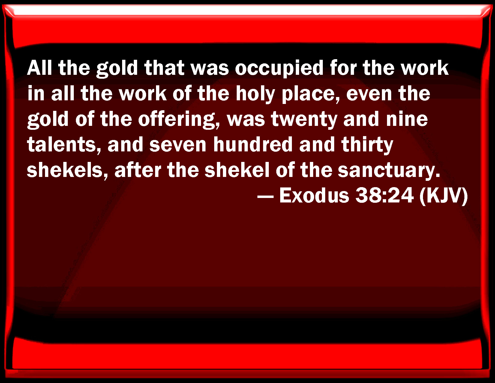 Bible Verse Slide Exodus 38:24 All the gold that was occupied for the work in all the work of the holy place, even the gold of the offering, was twenty and nine talents, and seven hundred and thirty shekels, after the shekel of the sanctuary. KJV: All the gold that was occupied for the work in all the work of the holy place, even the gold of the offering, was twenty and nine talents, and seven hundred and thirty shekels, after the shekel of the sanctuary. DRB: All the gold that was spent in the work of the sanctuary, and that was offered in gifts was nine and twenty talents, and seven hundred and thirty sicles according to the standard of the sanctuary. DBT: All the gold that it took for the work in all the work of the sanctuary the gold of the wave-offering, was twenty-nine talents, and seven hundred and thirty shekels, according to the shekel of the sanctuary. ERV: All the gold that was used for the work in all the work of the sanctuary, even the gold of the offering, was twenty and nine talents, and seven hundred and thirty shekels, after the shekel of the sanctuary. WBT: All the gold that was occupied for the work in all the work of the holy place, even the gold of the offering, was twenty and nine talents, and seven hundred and thirty shekels, after the shekel of the sanctuary. WEB: All the gold that was used for the work in all the work of the sanctuary, even the gold of the offering, was twenty-nine talents, and seven hundred thirty shekels, after the shekel of the sanctuary. YLT: All the gold which is prepared for the work in all the work of the sanctuary (and it is the gold of the wave-offering) is twenty and nine talents, and seven hundred and thirty shekels, by the shekel of the sanctuary.Links Exodus 38:24 NIV • Exodus 38:24 NLT • Exodus 38:24 ESV • Exodus 38:24 NASB • Exodus 38:24 KJV • Exodus 38:24 Interlinear • Exodus 38:24 Commentaries • Exodus 38:24 Parallel Texts • Exodus 38:24 Bible Apps • Exodus 38:24 Parallel • Bible Hub |
