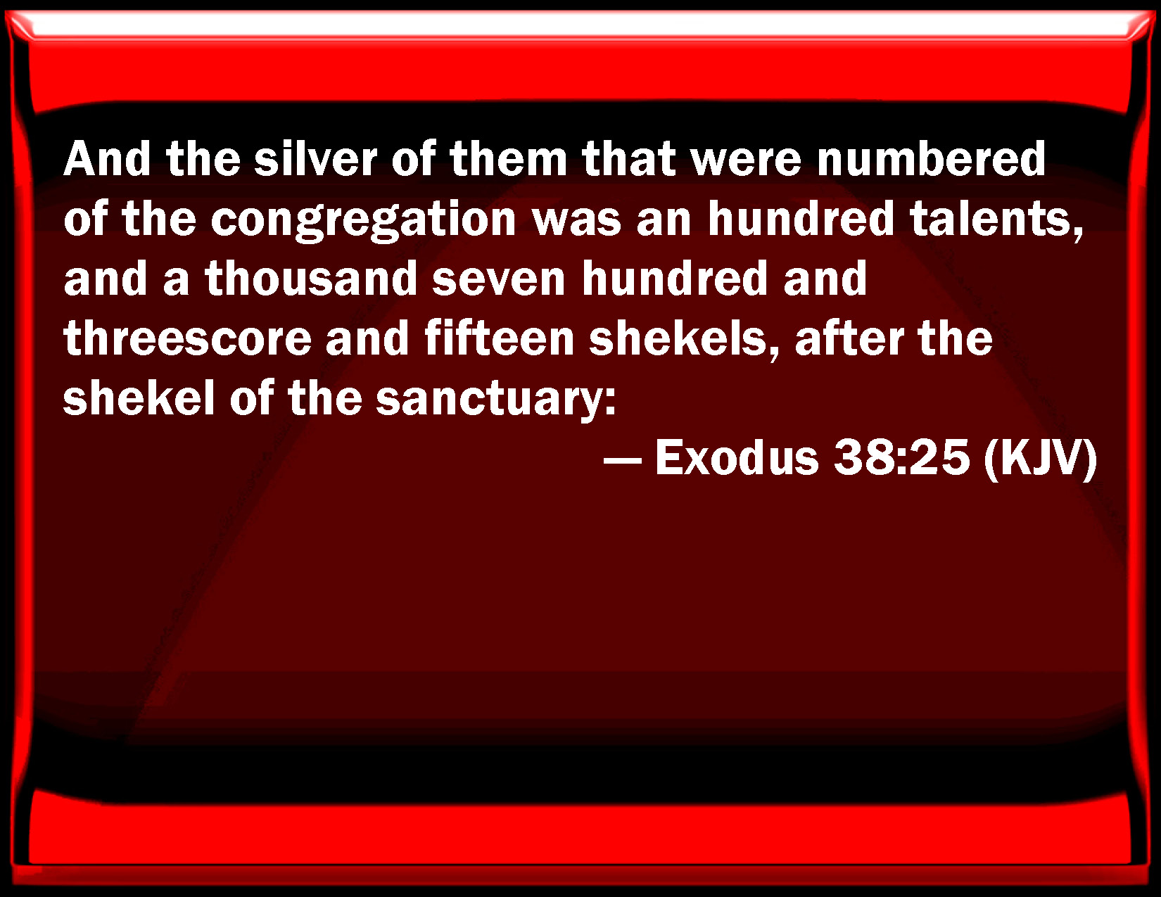 Bible Verse Slide Exodus 38:25 And the silver of them that were numbered of the congregation was an hundred talents, and a thousand seven hundred and three score and fifteen shekels, after the shekel of the sanctuary: KJV: And the silver of them that were numbered of the congregation was an hundred talents, and a thousand seven hundred and threescore and fifteen shekels, after the shekel of the sanctuary: DRB: And it was offered by them that went to be numbered, from twenty years old and upwards, of six hundred and three thousand five hundred and fifty men able to bear arms. DBT: And the silver of them that were numbered of the assembly was a hundred talents, and a thousand seven hundred and seventy-five shekels, according to the shekel of the sanctuary: ERV: And the silver of them that were numbered of the congregation was an hundred talents, and a thousand seven hundred and threescore and fifteen shekels, after the shekel of the sanctuary: WBT: And the silver of them that were numbered of the congregation was a hundred talents, and a thousand seven hundred and seventy five shekels, after the shekel of the sanctuary: WEB: The silver of those who were numbered of the congregation was one hundred talents, and one thousand seven hundred seventy-five shekels, after the shekel of the sanctuary: YLT: And the silver of those numbered of the company is a hundred talents, and a thousand and seven hundred and five and seventy shekels, by the shekel of the sanctuary;Links Exodus 38:25 NIV • Exodus 38:25 NLT • Exodus 38:25 ESV • Exodus 38:25 NASB • Exodus 38:25 KJV • Exodus 38:25 Interlinear • Exodus 38:25 Commentaries • Exodus 38:25 Parallel Texts • Exodus 38:25 Bible Apps • Exodus 38:25 Parallel • Bible Hub |