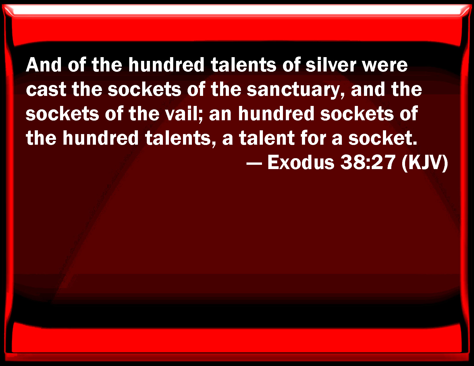 Bible Verse Slide Exodus 38:27 And of the hundred talents of silver were cast the sockets of the sanctuary, and the sockets of the veil; an hundred sockets of the hundred talents, a talent for a socket. KJV: And of the hundred talents of silver were cast the sockets of the sanctuary, and the sockets of the vail; an hundred sockets of the hundred talents, a talent for a socket. DRB: A hundred sockets were made of a hundred talents, one talent being reckoned for every socket. DBT: And there were a hundred talents of silver for casting the bases of the sanctuary, and the bases of the veil; a hundred bases of a hundred talents, a talent for a base. ERV: And the hundred talents of silver were for casting the sockets of the sanctuary, and the sockets of the veil; an hundred sockets for the hundred talents, a talent for a socket. WBT: And of the hundred talents of silver were cast the sockets of the sanctuary, and the sockets of the vail; a hundred sockets of the hundred talents, a talent for a socket. WEB: The one hundred talents of silver were for casting the sockets of the sanctuary, and the sockets of the veil; one hundred sockets for the one hundred talents, a talent for a socket. YLT: And a hundred talents of silver are to cast the sockets of the sanctuary, and the sockets of the vail; a hundred sockets for the hundred talents, a talent for a socket;Links Exodus 38:27 NIV • Exodus 38:27 NLT • Exodus 38:27 ESV • Exodus 38:27 NASB • Exodus 38:27 KJV • Exodus 38:27 Interlinear • Exodus 38:27 Commentaries • Exodus 38:27 Parallel Texts • Exodus 38:27 Bible Apps • Exodus 38:27 Parallel • Bible Hub |