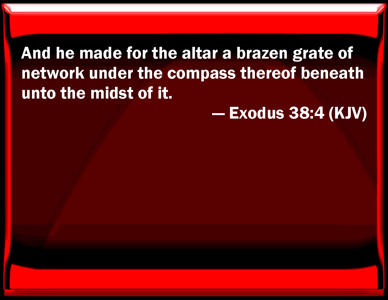 Bible Verse Slide Exodus 38:4 And he made for the altar a brazen grate of network under the compass thereof beneath to the middle of it. KJV: And he made for the altar a brasen grate of network under the compass thereof beneath unto the midst of it. DRB: And he made the grate thereof of brass, in manner of a net, and under it in the midst of the altar a hearth, DBT: And he made for the altar a grating of network of copper under its ledge from beneath, to the very middle of it. ERV: And he made for the altar a grating of network of brass, under the ledge round it beneath, reaching halfway up. WBT: And he made for the altar a brazen grate of net-work under the compass of it beneath to the midst of it. WEB: He made for the altar a grating of a network of brass, under the ledge around it beneath, reaching halfway up. YLT: And he maketh for the altar a brazen grate of net-work, under its border beneath, unto its midst;Links Exodus 38:4 NIV • Exodus 38:4 NLT • Exodus 38:4 ESV • Exodus 38:4 NASB • Exodus 38:4 KJV • Exodus 38:4 Interlinear • Exodus 38:4 Commentaries • Exodus 38:4 Parallel Texts • Exodus 38:4 Bible Apps • Exodus 38:4 Parallel • Bible Hub |