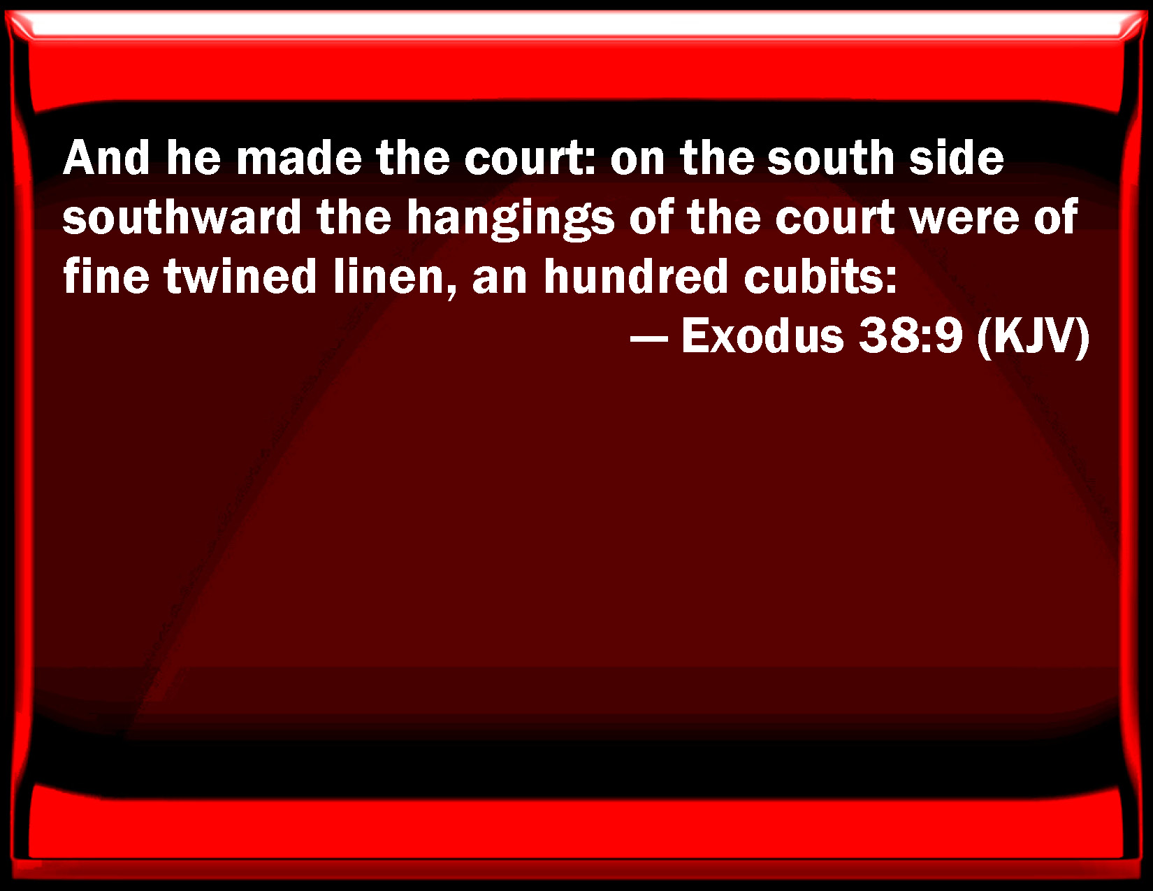 Bible Verse Slide Exodus 38:9 And he made the court: on the south side southward the hangings of the court were of fine twined linen, an hundred cubits: KJV: And he made the court: on the south side southward the hangings of the court were of fine twined linen, an hundred cubits: DRB: He made also the court, in the south side whereof were hangings of fine twisted linen, of a hundred cubits, DBT: And he made the court. On the south side southward, the hangings of the court were of twined byssus, a hundred cubits; ERV: And he made the court: for the south side southward the hangings of the court were of fine twined linen, an hundred cubits: WBT: And he made the court: on the south side southward the hangings of the court were of fine twined linen, a hundred cubits: WEB: He made the court: for the south side southward the hangings of the court were of fine twined linen, one hundred cubits; YLT: And he maketh the court; at the south side southward, the hangings of the court of twined linen, a hundred by the cubit,Links Exodus 38:9 NIV • Exodus 38:9 NLT • Exodus 38:9 ESV • Exodus 38:9 NASB • Exodus 38:9 KJV • Exodus 38:9 Interlinear • Exodus 38:9 Commentaries • Exodus 38:9 Parallel Texts • Exodus 38:9 Bible Apps • Exodus 38:9 Parallel • Bible Hub |