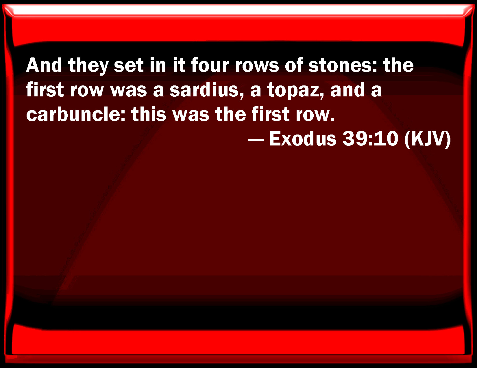 Bible Verse Slide Exodus 39:10 And they set in it four rows of stones: the first row was a sardius, a topaz, and a carbuncle: this was the first row. KJV: And they set in it four rows of stones: the first row was a sardius, a topaz, and a carbuncle: this was the first row. DRB: And he set four rows of precious stones in it. In the first row was a sardius, a topaz, and emerald. DBT: And they set in it four rows of stones: one row, a sardoin, a topaz, and an emerald the first row; ERV: And they set in it four rows of stones: a row of sardius, topaz, and carbuncle was the first row. WBT: And they set in it four rows of stones: the first row was a sardius, a topaz, and a carbuncle: this was the first row. WEB: They set in it four rows of stones. A row of ruby, topaz, and beryl was the first row; YLT: And they fill in it four rows of stones; a row of a sardius, a topaz, and a carbuncle is the one row;Links Exodus 39:10 NIV • Exodus 39:10 NLT • Exodus 39:10 ESV • Exodus 39:10 NASB • Exodus 39:10 KJV • Exodus 39:10 Interlinear • Exodus 39:10 Commentaries • Exodus 39:10 Parallel Texts • Exodus 39:10 Bible Apps • Exodus 39:10 Parallel • Bible Hub |