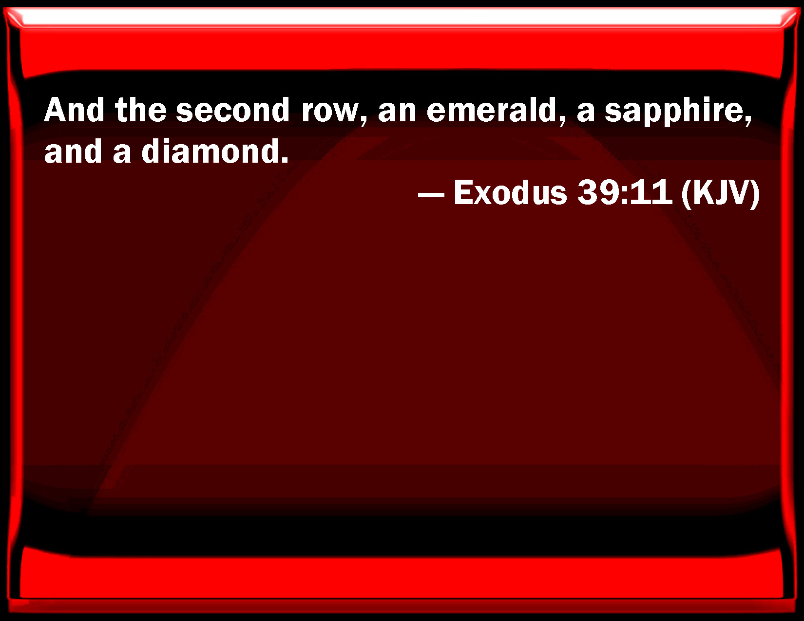 Bible Verse Slide Exodus 39:11 And the second row, an emerald, a sapphire, and a diamond. KJV: And the second row, an emerald, a sapphire, and a diamond. DRB: In the second, a carbuncle, a sapphire, and a jasper. DBT: and the second row, a carbuncle, a sapphire, and a diamond; ERV: And the second row, an emerald, a sapphire, and a diamond. WBT: And the second row, an emerald, a sapphire, and a diamond. WEB: and the second row, a turquoise, a sapphire, and an emerald; YLT: and the second row an emerald, a sapphire, and a diamond;Links Exodus 39:11 NIV • Exodus 39:11 NLT • Exodus 39:11 ESV • Exodus 39:11 NASB • Exodus 39:11 KJV • Exodus 39:11 Interlinear • Exodus 39:11 Commentaries • Exodus 39:11 Parallel Texts • Exodus 39:11 Bible Apps • Exodus 39:11 Parallel • Bible Hub |