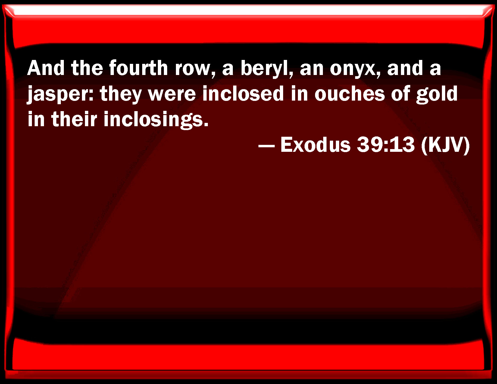 Bible Verse Slide Exodus 39:13 And the fourth row, a beryl, an onyx, and a jasper: they were enclosed in ouches of gold in their settings. KJV: And the fourth row, a beryl, an onyx, and a jasper: they were inclosed in ouches of gold in their inclosings. DRB: In the fourth, a chrysolite, an onyx, and a beryl, set and enclosed in gold by their rows. DBT: and the fourth row, a chrysolite, an onyx, and a jasper; mounted in enclosures of gold in their settings. ERV: And the fourth row, a beryl, an onyx, and a jasper: they were enclosed in ouches of gold in their settings. WBT: And the fourth row, a beryl, an onyx, and a jasper: they were inclosed in ouches of gold in their inclosings. WEB: and the fourth row, a chrysolite, an onyx, and a jasper. They were enclosed in gold settings. YLT: and the fourth row a beryl, an onyx, and a jasper — set, embroidered with gold, in their settings.Links Exodus 39:13 NIV • Exodus 39:13 NLT • Exodus 39:13 ESV • Exodus 39:13 NASB • Exodus 39:13 KJV • Exodus 39:13 Interlinear • Exodus 39:13 Commentaries • Exodus 39:13 Parallel Texts • Exodus 39:13 Bible Apps • Exodus 39:13 Parallel • Bible Hub |