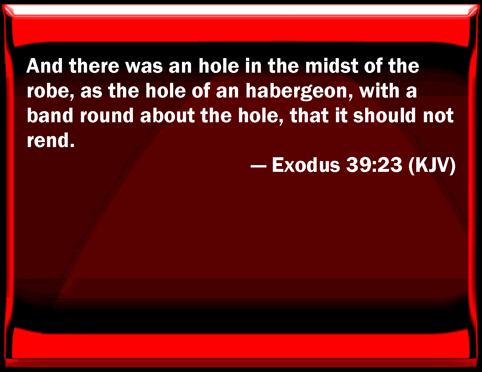 Bible Verse Slide Exodus 39:23 And there was an hole in the middle of the robe, as the hole of an habergeon, with a band round about the hole, that it should not rend. KJV: And there was an hole in the midst of the robe, as the hole of an habergeon, with a band round about the hole, that it should not rend. DRB: And little bells of the purest gold, which they put between the pomegranates at the bottom of the tunick round about: DBT: and the opening of the cloak in its middle, as the opening of a coat of mail; a binding was round about the opening, that it should not rend. ERV: and the hole of the robe in the midst thereof, as the hole of a coat of mail, with a binding round about the hole of it, that it should not be rent. WBT: And there was a hole in the midst of the robe, as the hole of an habergeon, with a band around the hole, that it should not rend. WEB: The opening of the robe in its midst was like the opening of a coat of mail, with a binding around its opening, that it should not be torn. YLT: and the opening of the upper robe is in its midst, as the opening of a habergeon, a border is to its opening round about, it is not rent;Links Exodus 39:23 NIV • Exodus 39:23 NLT • Exodus 39:23 ESV • Exodus 39:23 NASB • Exodus 39:23 KJV • Exodus 39:23 Interlinear • Exodus 39:23 Commentaries • Exodus 39:23 Parallel Texts • Exodus 39:23 Bible Apps • Exodus 39:23 Parallel • Bible Hub |