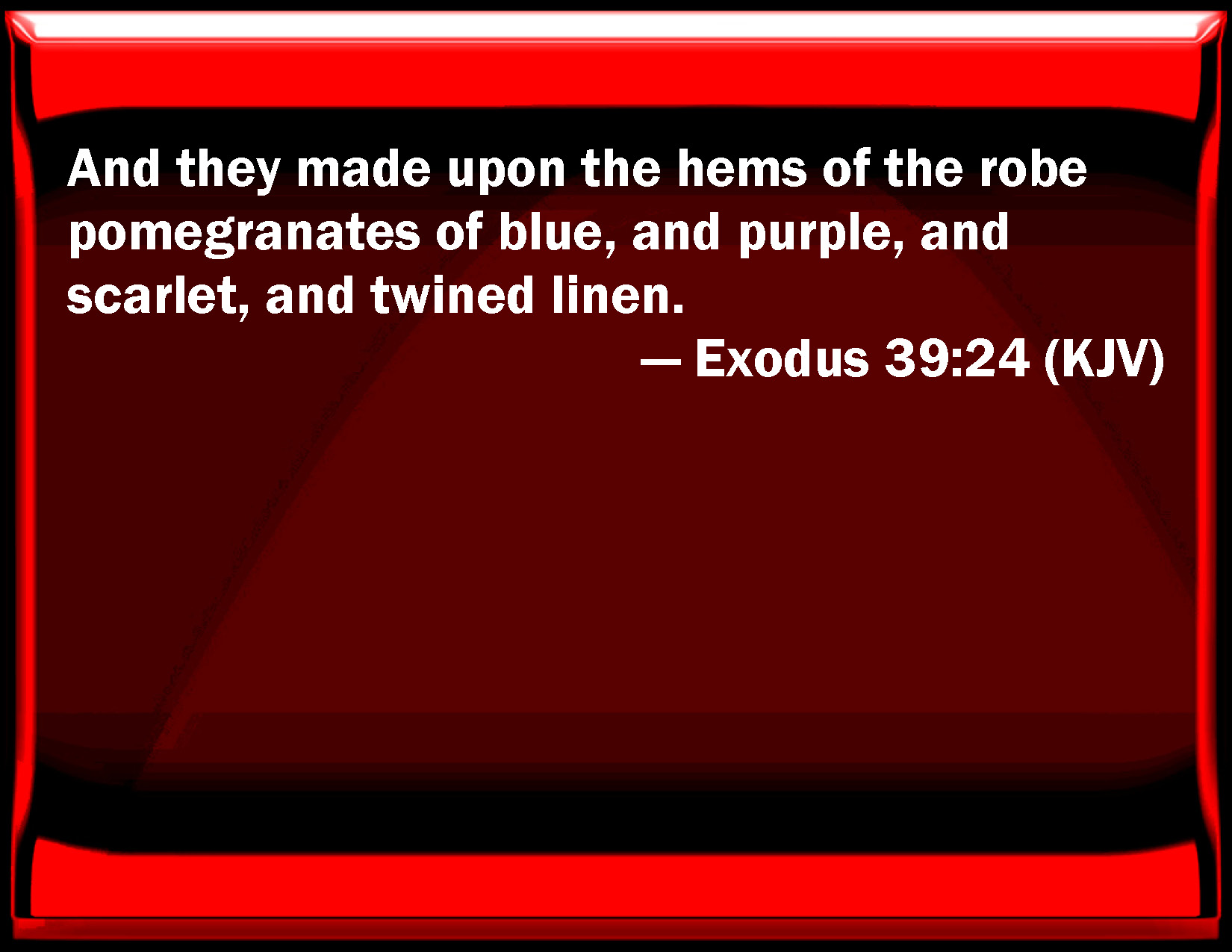 Bible Verse Slide Exodus 39:24 And they made on the hems of the robe pomegranates of blue, and purple, and scarlet, and twined linen. KJV: And they made upon the hems of the robe pomegranates of blue, and purple, and scarlet, and twined linen. DRB: To wit, a bell of gold, and a pomegranate, wherewith the high priest went adorned, when he discharged his ministry, as the Lord had commanded Moses. DBT: And they made on the skirts of the cloak pomegranates of blue and purple and scarlet, twined. ERV: And they made upon the skirts of the robe pomegranates of blue, and purple, and scarlet, and twined linen. WBT: And they made upon the hems of the robe pomegranates of blue, and purple, and scarlet, and twined linen. WEB: They made on the skirts of the robe pomegranates of blue, purple, scarlet, and twined linen. YLT: and they make on the hems of the upper robe pomegranates of blue, and purple, and scarlet, twined.Links Exodus 39:24 NIV • Exodus 39:24 NLT • Exodus 39:24 ESV • Exodus 39:24 NASB • Exodus 39:24 KJV • Exodus 39:24 Interlinear • Exodus 39:24 Commentaries • Exodus 39:24 Parallel Texts • Exodus 39:24 Bible Apps • Exodus 39:24 Parallel • Bible Hub |