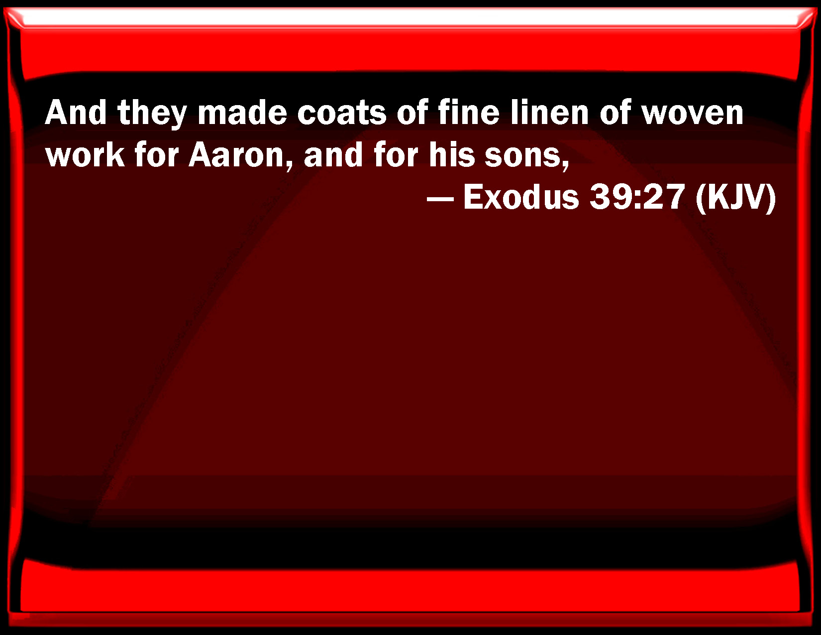 Bible Verse Slide Exodus 39:27 And they made coats of fine linen of woven work for Aaron, and for his sons, KJV: And they made coats of fine linen of woven work for Aaron, and for his sons, DRB: And linen breeches of fine linen: DBT: And they made the vests of byssus of woven work, for Aaron, and for his sons; ERV: And they made the coats of fine linen of woven work for Aaron, and for his sons, WBT: And they made coats of fine linen, of woven work, for Aaron and for his sons, WEB: They made the coats of fine linen of woven work for Aaron, and for his sons, YLT: And they make the coats of linen, work of a weaver, for Aaron and for his sons,Links Exodus 39:27 NIV • Exodus 39:27 NLT • Exodus 39:27 ESV • Exodus 39:27 NASB • Exodus 39:27 KJV • Exodus 39:27 Interlinear • Exodus 39:27 Commentaries • Exodus 39:27 Parallel Texts • Exodus 39:27 Bible Apps • Exodus 39:27 Parallel • Bible Hub |