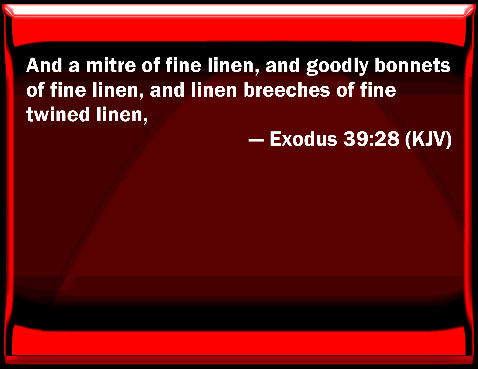 Bible Verse Slide Exodus 39:28 And a turban of fine linen, and goodly bonnets of fine linen, and linen breeches of fine twined linen, KJV: And a mitre of fine linen, and goodly bonnets of fine linen, and linen breeches of fine twined linen, DRB: And a girdle of fine twisted linen, violet, purple, and scarlet twice dyed, of embroidery work, as the Lord had commanded Moses. DBT: and the turban of byssus; and the ornamental caps, of byssus; and the linen trousers, of twined byssus; ERV: and the mitre of fine linen, and the goodly headtires of fine linen, and the linen breeches of fine twined linen, WBT: And a miter of fine linen, and goodly bonnets of fine linen, and linen breeches of fine twined linen, WEB: and the turban of fine linen, and the linen headbands of fine linen, and the linen breeches of fine twined linen, YLT: and the mitre of linen, and the beautiful bonnets of linen, and the linen trousers, of twined linen,Links Exodus 39:28 NIV • Exodus 39:28 NLT • Exodus 39:28 ESV • Exodus 39:28 NASB • Exodus 39:28 KJV • Exodus 39:28 Interlinear • Exodus 39:28 Commentaries • Exodus 39:28 Parallel Texts • Exodus 39:28 Bible Apps • Exodus 39:28 Parallel • Bible Hub |