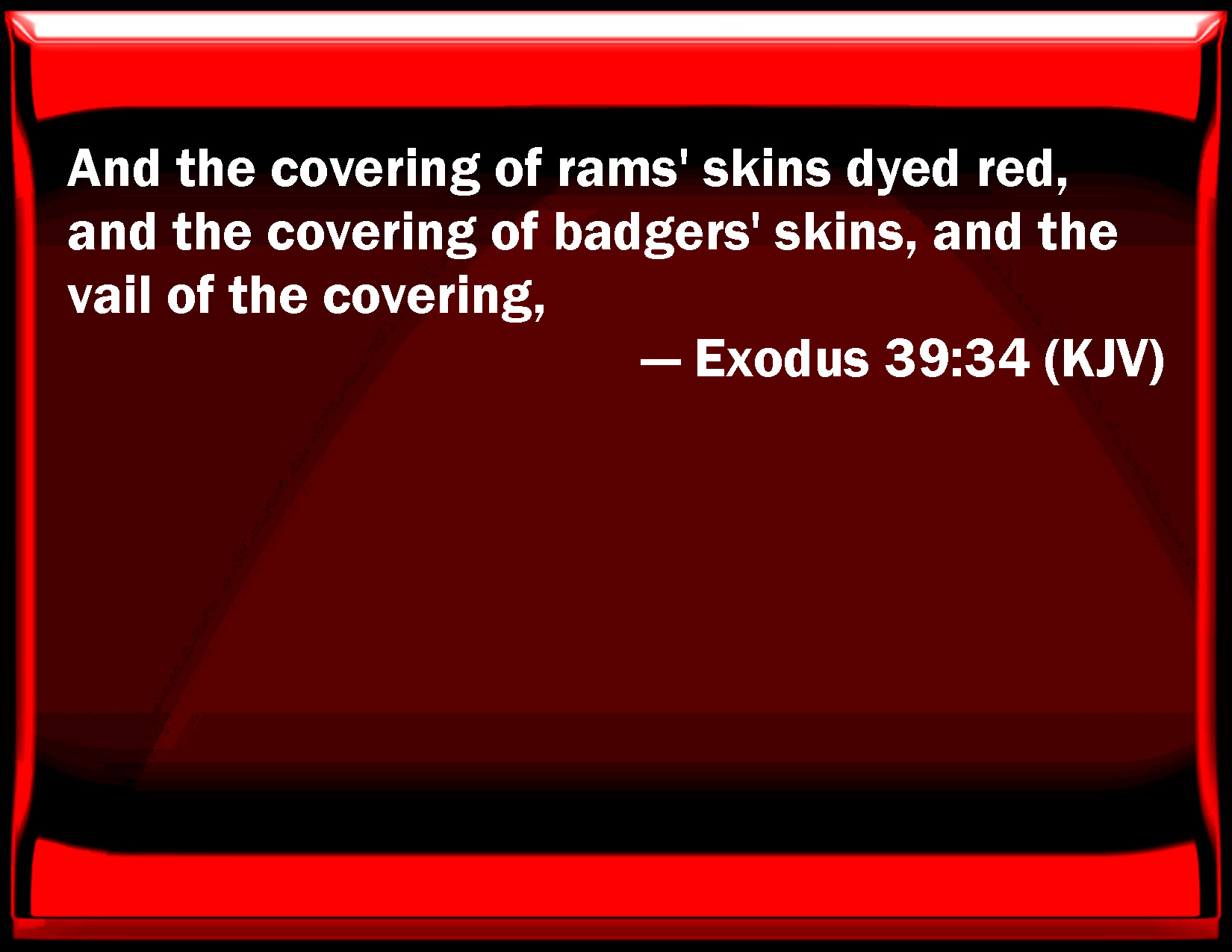 Bible Verse Slide Exodus 39:34 And the covering of rams' skins dyed red, and the covering of badgers' skins, and the veil of the covering, KJV: And the covering of rams' skins dyed red, and the covering of badgers' skins, and the vail of the covering, DRB: The veil, the ark, the bars, the propitiatory, DBT: and the covering of rams' skins dyed red, and the covering of badgers' skins, and the veil of separation; ERV: and the covering of rams' skins dyed red, and the covering of sealskins, and the veil of the screen; WBT: And the covering of rams' skins dyed red, and the covering of badgers' skins, and the vail of the covering, WEB: the covering of rams' skins dyed red, the covering of sea cow hides, the veil of the screen, YLT: and the covering of rams' skins, which are made red, and the covering of badgers' skins, and the vail of the covering;Links Exodus 39:34 NIV • Exodus 39:34 NLT • Exodus 39:34 ESV • Exodus 39:34 NASB • Exodus 39:34 KJV • Exodus 39:34 Interlinear • Exodus 39:34 Commentaries • Exodus 39:34 Parallel Texts • Exodus 39:34 Bible Apps • Exodus 39:34 Parallel • Bible Hub |