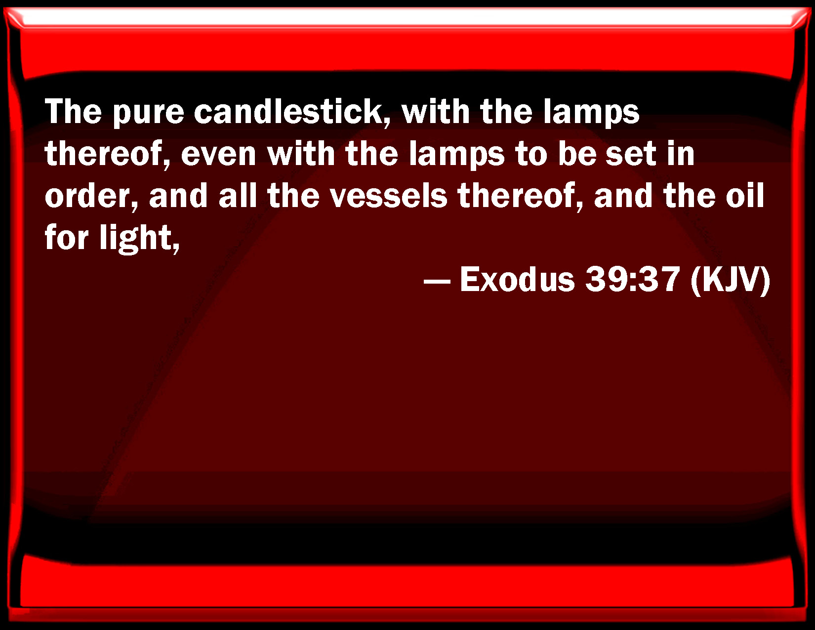Bible Verse Slide Exodus 39:37 The pure candlestick, with the lamps thereof, even with the lamps to be set in order, and all the vessels thereof, and the oil for light, KJV: The pure candlestick, with the lamps thereof, even with the lamps to be set in order, and all the vessels thereof, and the oil for light, DRB: The altar of gold, and the ointment, and the incense of spices: DBT: the pure candlestick, its lamps, the lamps set in order, and all its utensils, and the oil for the light; ERV: the pure candlestick, the lamps thereof, even the lamps to be set in order, and all the vessels thereof, and the oil for the light; WBT: The pure candlestick, with its lamps, even with the lamps to be set in order, and all its vessels, and the oil for light, WEB: the pure lampstand, its lamps, even the lamps to be set in order, all its vessels, the oil for the light, YLT: the pure candlestick, its lamps, the lamps of arrangement, and all its vessels, and the oil for the light.Links Exodus 39:37 NIV • Exodus 39:37 NLT • Exodus 39:37 ESV • Exodus 39:37 NASB • Exodus 39:37 KJV • Exodus 39:37 Interlinear • Exodus 39:37 Commentaries • Exodus 39:37 Parallel Texts • Exodus 39:37 Bible Apps • Exodus 39:37 Parallel • Bible Hub |