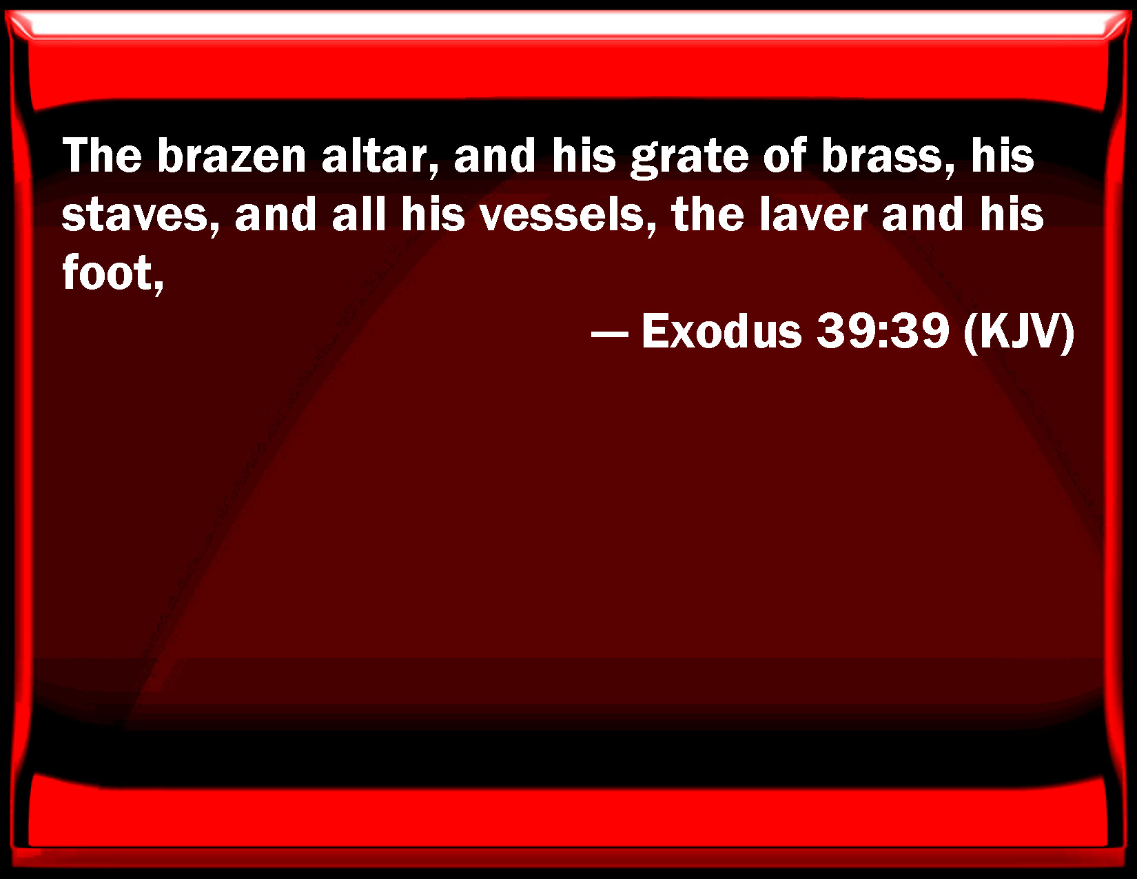Bible Verse Slide Exodus 39:39 The brazen altar, and his grate of brass, his staves, and all his vessels, the laver and his foot, KJV: The brasen altar, and his grate of brass, his staves, and all his vessels, the laver and his foot, DRB: The altar of brass, the grate, the bars, and all the vessels thereof: the laver with the foot thereof: the hangings of the court, and the pillars with their sockets: DBT: the copper altar, and the copper grating that was for it, its staves and all its utensils; the laver and its stand; ERV: the brasen altar, and its grating of brass, its staves, and all its vessels, the laver and its base; WBT: The brazen altar, and its grate of brass, its staffs, and all its vessels, the laver and its foot, WEB: the bronze altar, its grating of brass, its poles, all of its vessels, the basin and its base, YLT: the brazen altar and the brazen grate which it hath, its staves, and all its vessels, the laver and its base.Links Exodus 39:39 NIV • Exodus 39:39 NLT • Exodus 39:39 ESV • Exodus 39:39 NASB • Exodus 39:39 KJV • Exodus 39:39 Interlinear • Exodus 39:39 Commentaries • Exodus 39:39 Parallel Texts • Exodus 39:39 Bible Apps • Exodus 39:39 Parallel • Bible Hub |