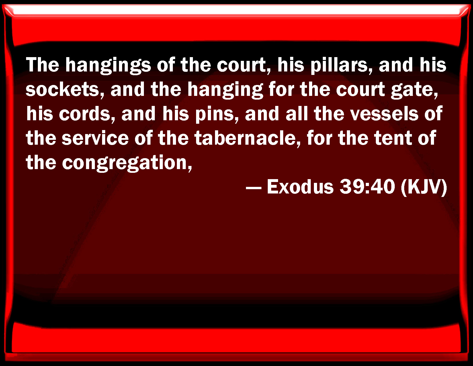 Bible Verse Slide Exodus 39:40 The hangings of the court, his pillars, and his sockets, and the hanging for the court gate, his cords, and his pins, and all the vessels of the service of the tabernacle, for the tent of the congregation, KJV: The hangings of the court, his pillars, and his sockets, and the hanging for the court gate, his cords, and his pins, and all the vessels of the service of the tabernacle, for the tent of the congregation, DRB: The hanging in the entry of the court, and the little cords, and the pins thereof. Nothing was wanting of the vessels, that were commanded to be made for the ministry of the tabernacle, and for the roof of the covenant. DBT: the hangings of the court, its pillars, and its bases; and the curtain for the gate of the court, its cords, and its pegs; and all the vessel's of service of the tabernacle, for the tent of meeting; ERV: the hangings of the court, its pillars, and its sockets, and the screen for the gate of the court, the cords thereof, and the pins thereof, and all the instruments of the service of the tabernacle, for the tent of meeting; WBT: The hangings of the court, its pillars, and its sockets, and the hanging for the court-gate, its cords, and its pins, and all the vessels of the service of the tabernacle, for the tent of the congregation, WEB: the hangings of the court, its pillars, its sockets, the screen for the gate of the court, its cords, its pins, all the instruments of the service of the tabernacle, for the Tent of Meeting, YLT: The hangings of the court, its pillars, and its sockets; and the covering for the gate of the court, its cords, and its pins; and all the vessels of the service of the tabernacle, for the tent of meeting;Links Exodus 39:40 NIV • Exodus 39:40 NLT • Exodus 39:40 ESV • Exodus 39:40 NASB • Exodus 39:40 KJV • Exodus 39:40 Interlinear • Exodus 39:40 Commentaries • Exodus 39:40 Parallel Texts • Exodus 39:40 Bible Apps • Exodus 39:40 Parallel • Bible Hub |