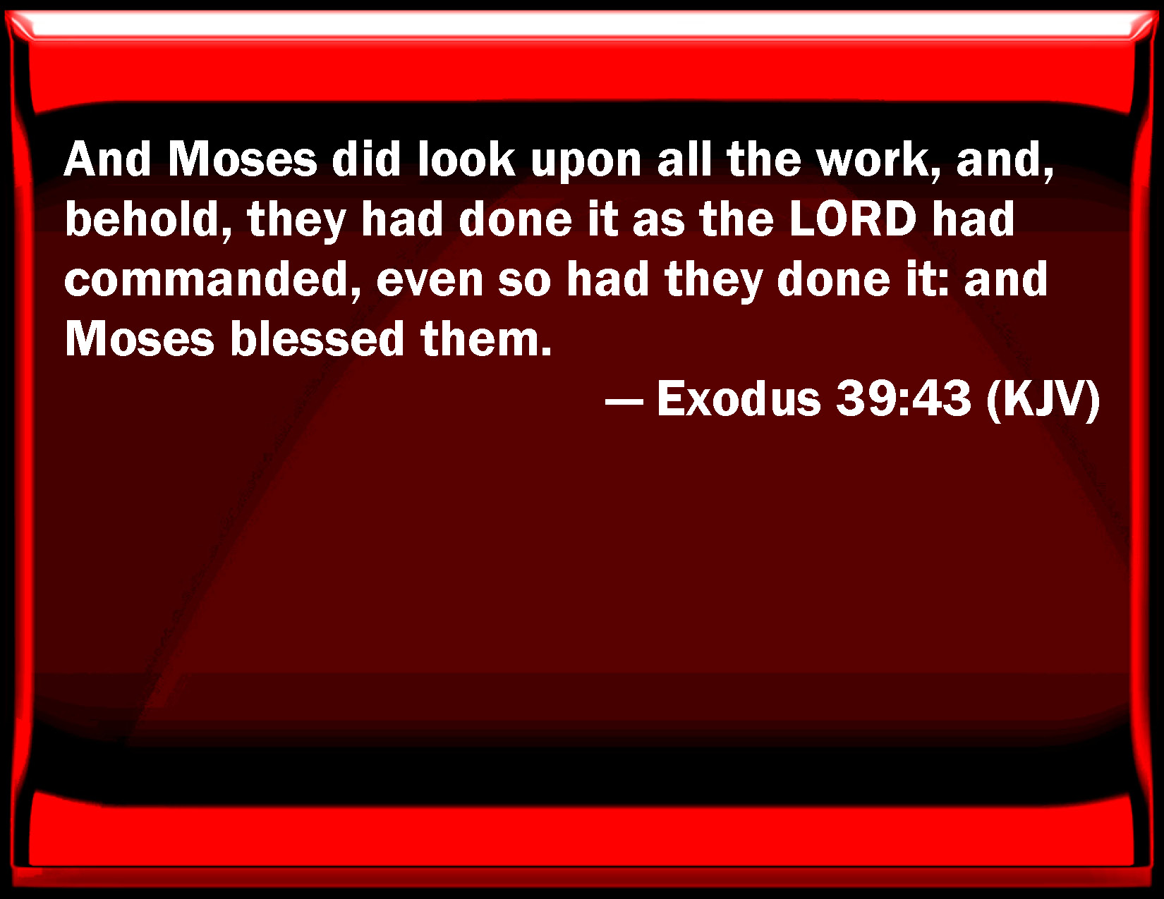Bible Verse Slide Exodus 39:43 And Moses did look on all the work, and, behold, they had done it as the LORD had commanded, even so had they done it: and Moses blessed them. KJV: And Moses did look upon all the work, and, behold, they had done it as the LORD had commanded, even so had they done it: and Moses blessed them. DRB: And when Moses saw all things finished, he blessed them. DBT: And Moses saw all the work, and behold, they had done it as Jehovah had commanded so had they done it; and Moses blessed them. ERV: And Moses saw all the work, and, behold, they had done it; as the LORD had commanded, even so had they done it: and Moses blessed them. WBT: And Moses looked upon all the work, and behold, they had done it as the LORD had commanded, even so had they done it: and Moses blessed them. WEB: Moses saw all the work, and behold, they had done it as Yahweh had commanded, even so had they done it: and Moses blessed them. YLT: and Moses seeth all the work, and lo, they have done it as Jehovah hath commanded; so they have done. And Moses doth bless them.Links Exodus 39:43 NIV • Exodus 39:43 NLT • Exodus 39:43 ESV • Exodus 39:43 NASB • Exodus 39:43 KJV • Exodus 39:43 Interlinear • Exodus 39:43 Commentaries • Exodus 39:43 Parallel Texts • Exodus 39:43 Bible Apps • Exodus 39:43 Parallel • Bible Hub |