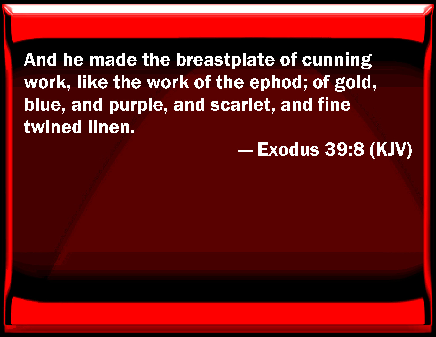 Bible Verse Slide Exodus 39:8 And he made the breastplate of cunning work, like the work of the ephod; of gold, blue, and purple, and scarlet, and fine twined linen. KJV: And he made the breastplate of cunning work, like the work of the ephod; of gold, blue, and purple, and scarlet, and fine twined linen. DRB: He made also a rational with embroidered work, according to the work of the ephod, of gold, violet, purple, and scarlet twice dyed, and fine twisted linen, DBT: And he made the breastplate of artistic work, like the work of the ephod, of gold, blue, and purple, and scarlet, and twined byssus. ERV: And he made the breastplate, the work of the cunning workman, like the work of the ephod; of gold, of blue, and purple, and scarlet, and fine twined linen. WBT: And he made the breast-plate of curious work, like the work of the ephod; of gold, blue, and purple, and scarlet, and fine twined linen. WEB: He made the breastplate, the work of a skillful workman, like the work of the ephod; of gold, of blue, purple, scarlet, and fine twined linen. YLT: And he maketh the breastplate, work of a designer, like the work of the ephod, of gold, blue, and purple, and scarlet, and twined linen;Links Exodus 39:8 NIV • Exodus 39:8 NLT • Exodus 39:8 ESV • Exodus 39:8 NASB • Exodus 39:8 KJV • Exodus 39:8 Interlinear • Exodus 39:8 Commentaries • Exodus 39:8 Parallel Texts • Exodus 39:8 Bible Apps • Exodus 39:8 Parallel • Bible Hub |