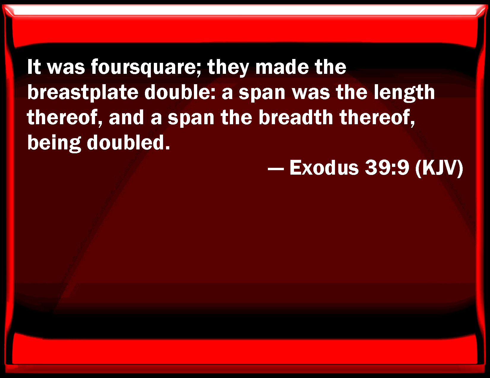 Bible Verse Slide Exodus 39:9 It was foursquare; they made the breastplate double: a span was the length thereof, and a span the breadth thereof, being doubled. KJV: It was foursquare; they made the breastplate double: a span was the length thereof, and a span the breadth thereof, being doubled. DRB: Foursquare, double, of the measure of a span. DBT: It was square; double did they make the breastplate, a span the length thereof, and a span the breadth thereof, doubled. ERV: It was foursquare; they made the breastplate double: a span was the length thereof, and a span the breadth thereof, being double. WBT: It was foursquare; they made the breast-plate double: a span was the length of it, and a span the breadth of it, being doubled. WEB: It was square. They made the breastplate double. Its length was a span, and its breadth a span, being double. YLT: it hath been square; double they have made the breastplate, a span its length, and a span its breadth, doubled.Links Exodus 39:9 NIV • Exodus 39:9 NLT • Exodus 39:9 ESV • Exodus 39:9 NASB • Exodus 39:9 KJV • Exodus 39:9 Interlinear • Exodus 39:9 Commentaries • Exodus 39:9 Parallel Texts • Exodus 39:9 Bible Apps • Exodus 39:9 Parallel • Bible Hub |