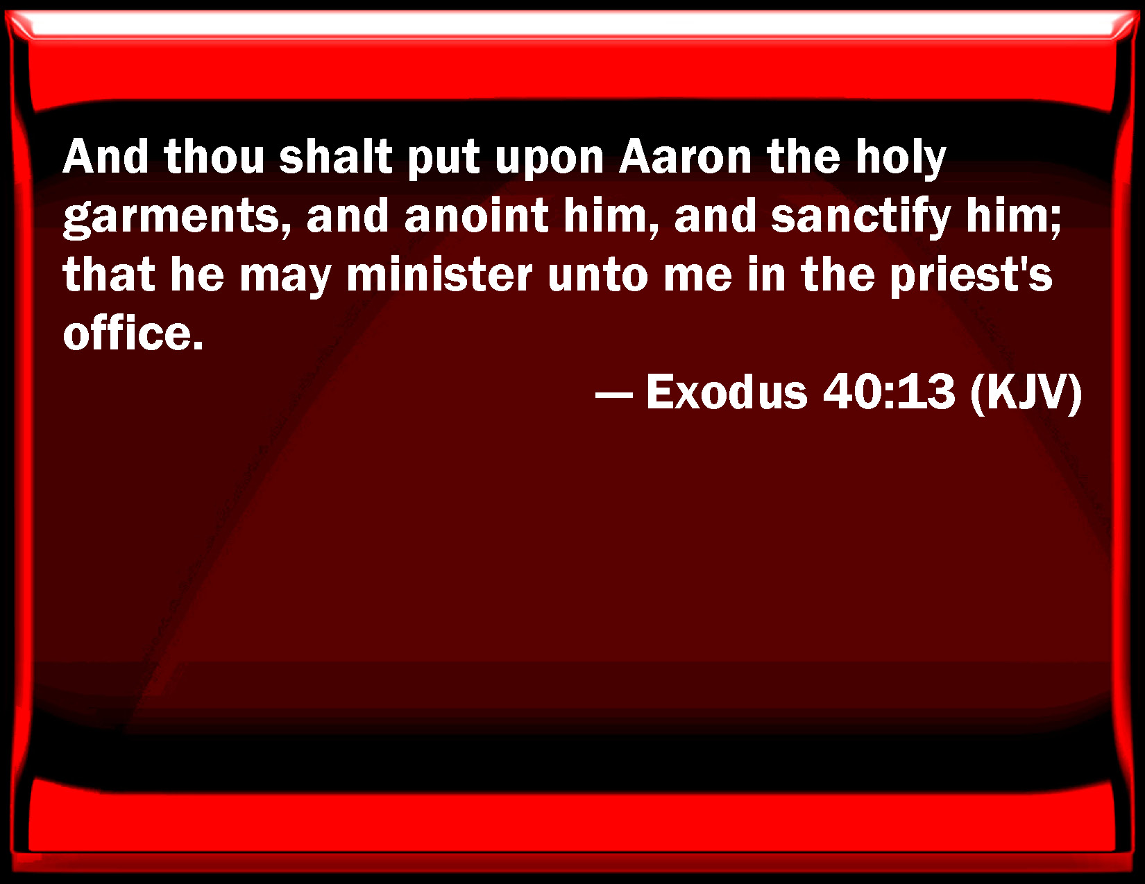 Bible Verse Slide Exodus 40:13 And you shall put on Aaron the holy garments, and anoint him, and sanctify him; that he may minister to me in the priest's office. KJV: And thou shalt put upon Aaron the holy garments, and anoint him, and sanctify him; that he may minister unto me in the priest's office. DRB: Thou shalt put on them the holy vestments, that they may minister to me, and that the unction of them may prosper to an everlasting priesthood. DBT: And thou shalt clothe Aaron with the holy garments, and anoint him, and hallow him, that he may serve me as priest. ERV: And thou shalt put upon Aaron the holy garments; and thou shalt anoint him, and sanctify him, that he may minister unto me in the priest's office. WBT: And thou shalt put upon Aaron the holy garments, and anoint him, and sanctify him; that he may minister to me in the priest's office. WEB: You shall put on Aaron the holy garments; and you shall anoint him, and sanctify him, that he may minister to me in the priest's office. YLT: and thou hast clothed Aaron with the holy garments, and anointed him, and sanctified him, and he hath acted as priest to Me.Links Exodus 40:13 NIV • Exodus 40:13 NLT • Exodus 40:13 ESV • Exodus 40:13 NASB • Exodus 40:13 KJV • Exodus 40:13 Interlinear • Exodus 40:13 Commentaries • Exodus 40:13 Parallel Texts • Exodus 40:13 Bible Apps • Exodus 40:13 Parallel • Bible Hub |