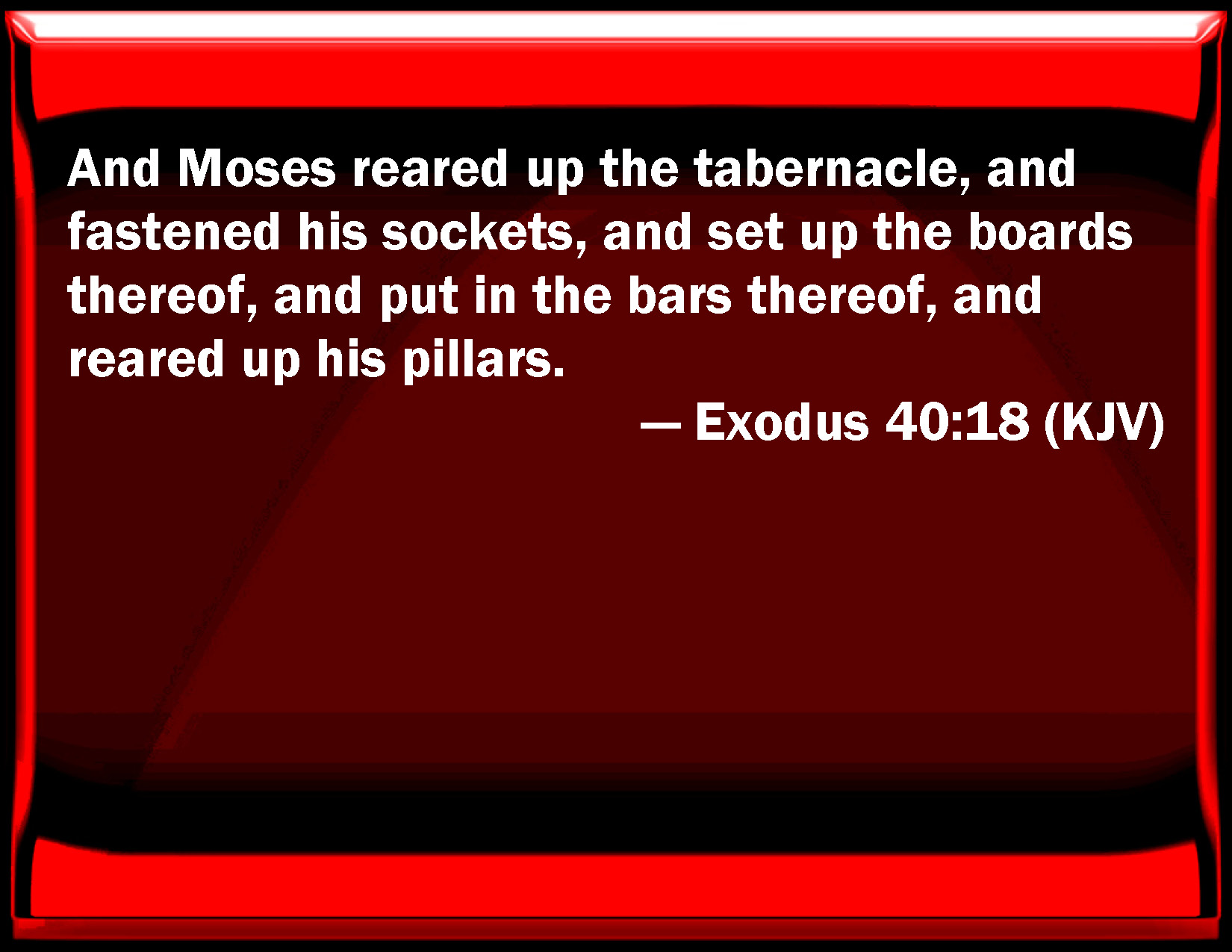 Bible Verse Slide Exodus 40:18 And Moses reared up the tabernacle, and fastened his sockets, and set up the boards thereof, and put in the bars thereof, and reared up his pillars. KJV: And Moses reared up the tabernacle, and fastened his sockets, and set up the boards thereof, and put in the bars thereof, and reared up his pillars. DRB: And Moses reared it up, and placed the boards and the sockets and the bars, and set up the pillars, DBT: And Moses set up the tabernacle, and put in its bases, and fixed its boards, and put in its bars, and set up its pillars. ERV: And Moses reared up the tabernacle, and laid its sockets, and set up the boards thereof, and put in the bars thereof, and reared up its pillars. WBT: And Moses reared up the tabernacle, and fastened its sockets, and set up its boards, and put in its bars, and reared up its pillars. WEB: Moses raised up the tabernacle, and laid its sockets, and set up its boards, and put in its bars, and raised up its pillars. YLT: and Moses raiseth up the tabernacle, and setteth its sockets, and placeth its boards, and placeth its bars, and raiseth its pillars,Links Exodus 40:18 NIV • Exodus 40:18 NLT • Exodus 40:18 ESV • Exodus 40:18 NASB • Exodus 40:18 KJV • Exodus 40:18 Interlinear • Exodus 40:18 Commentaries • Exodus 40:18 Parallel Texts • Exodus 40:18 Bible Apps • Exodus 40:18 Parallel • Bible Hub |