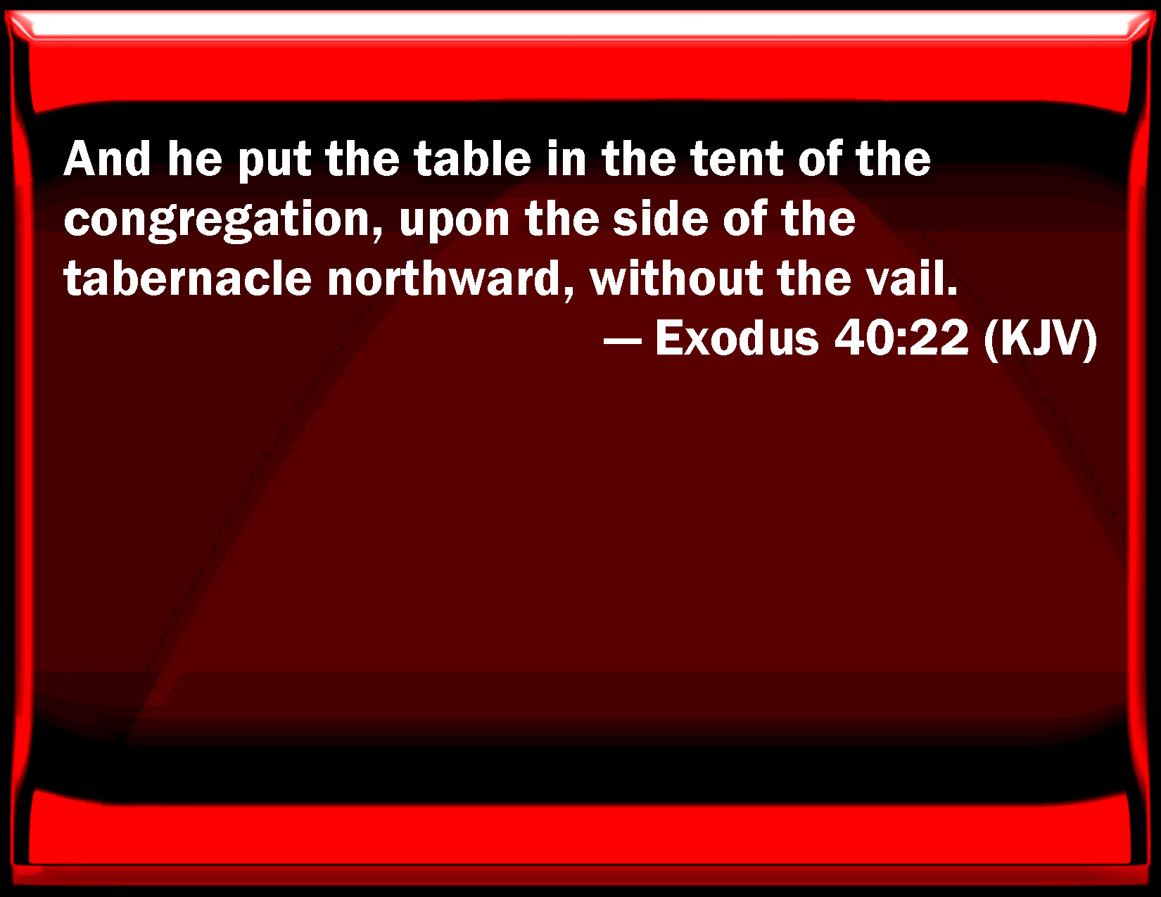Bible Verse Slide Exodus 40:22 And he put the table in the tent of the congregation, on the side of the tabernacle northward, without the veil. KJV: And he put the table in the tent of the congregation, upon the side of the tabernacle northward, without the vail. DRB: And he set the table in the tabernacle of the testimony at the north side without the veil, DBT: And he put the table in the tent of meeting, on the side of the tabernacle northward, outside the veil, ERV: And he put the table in the tent of meeting, upon the side of the tabernacle northward, without the veil. WBT: And he put the table in the tent of the congregation, upon the side of the tabernacle northward, without the vail. WEB: He put the table in the Tent of Meeting, on the side of the tabernacle northward, outside of the veil. YLT: And he putteth the table in the tent of meeting, on the side of the tabernacle northward, at the outside of the vail,Links Exodus 40:22 NIV • Exodus 40:22 NLT • Exodus 40:22 ESV • Exodus 40:22 NASB • Exodus 40:22 KJV • Exodus 40:22 Interlinear • Exodus 40:22 Commentaries • Exodus 40:22 Parallel Texts • Exodus 40:22 Bible Apps • Exodus 40:22 Parallel • Bible Hub |