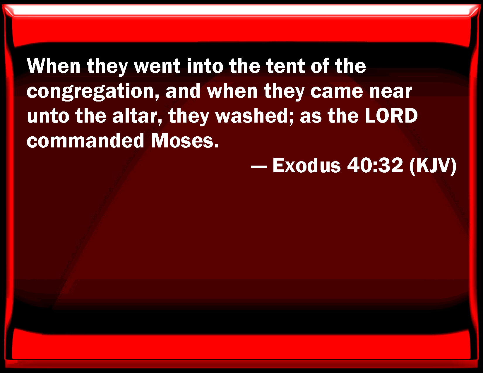 Bible Verse Slide Exodus 40:32 When they went into the tent of the congregation, and when they came near to the altar, they washed; as the LORD commanded Moses. KJV: When they went into the tent of the congregation, and when they came near unto the altar, they washed; as the LORD commanded Moses. DRB: When they went into the tabernacle of the covenant, and went to the altar, as the Lord had commanded Moses. DBT: when they went into the tent of meeting, and when they drew near to the altar, they washed; as Jehovah had commanded Moses. ERV: when they went into the tent of meeting, and when they came near unto the altar, they washed: as the LORD commanded Moses. WBT: When they went into the tent of the congregation, and when they came near to the altar, they washed; as the LORD commanded Moses. WEB: When they went into the Tent of Meeting, and when they came near to the altar, they washed, as Yahweh commanded Moses. YLT: in their going in unto the tent of meeting, and in their drawing near unto the altar, they wash, as Jehovah hath commanded Moses.Links Exodus 40:32 NIV • Exodus 40:32 NLT • Exodus 40:32 ESV • Exodus 40:32 NASB • Exodus 40:32 KJV • Exodus 40:32 Interlinear • Exodus 40:32 Commentaries • Exodus 40:32 Parallel Texts • Exodus 40:32 Bible Apps • Exodus 40:32 Parallel • Bible Hub |