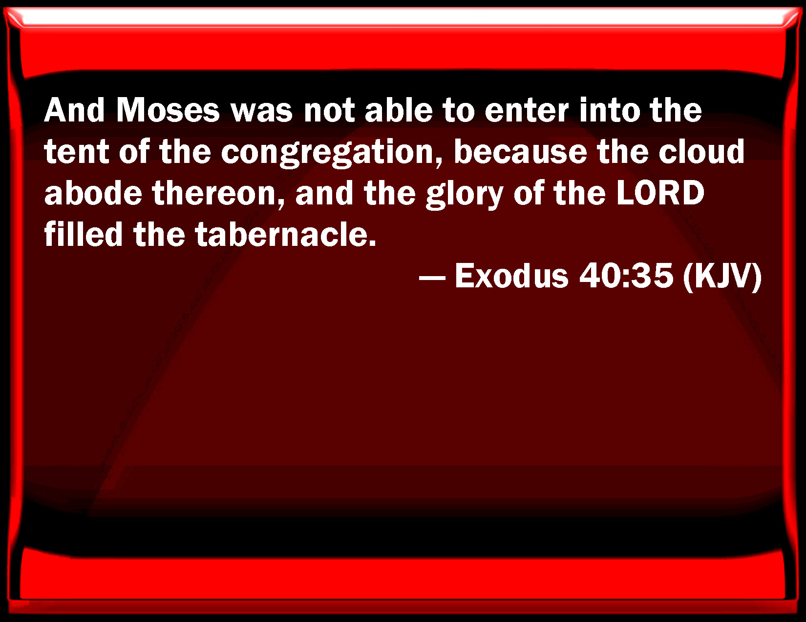 Bible Verse Slide Exodus 40:35 And Moses was not able to enter into the tent of the congregation, because the cloud stayed thereon, and the glory of the LORD filled the tabernacle. KJV: And Moses was not able to enter into the tent of the congregation, because the cloud abode thereon, and the glory of the LORD filled the tabernacle. DRB: Neither could Moses go into the tabernacle of the covenant, the cloud covering all things and the majesty of the Lord shining, for the cloud had covered all. DBT: And Moses could not enter into the tent of meeting, for the cloud abode on it, and the glory of Jehovah filled the tabernacle. ERV: And Moses was not able to enter into the tent of meeting, because the cloud abode thereon, and the glory of the LORD filled the tabernacle. WBT: And Moses was not able to enter into the tent of the congregation, because the cloud abode upon it, and the glory of the LORD filled the tabernacle. WEB: Moses wasn't able to enter into the Tent of Meeting, because the cloud stayed on it, and Yahweh's glory filled the tabernacle. YLT: and Moses hath not been able to go in unto the tent of meeting, for the cloud hath tabernacled on it, and the honour of Jehovah hath filled the tabernacle.Links Exodus 40:35 NIV • Exodus 40:35 NLT • Exodus 40:35 ESV • Exodus 40:35 NASB • Exodus 40:35 KJV • Exodus 40:35 Interlinear • Exodus 40:35 Commentaries • Exodus 40:35 Parallel Texts • Exodus 40:35 Bible Apps • Exodus 40:35 Parallel • Bible Hub |