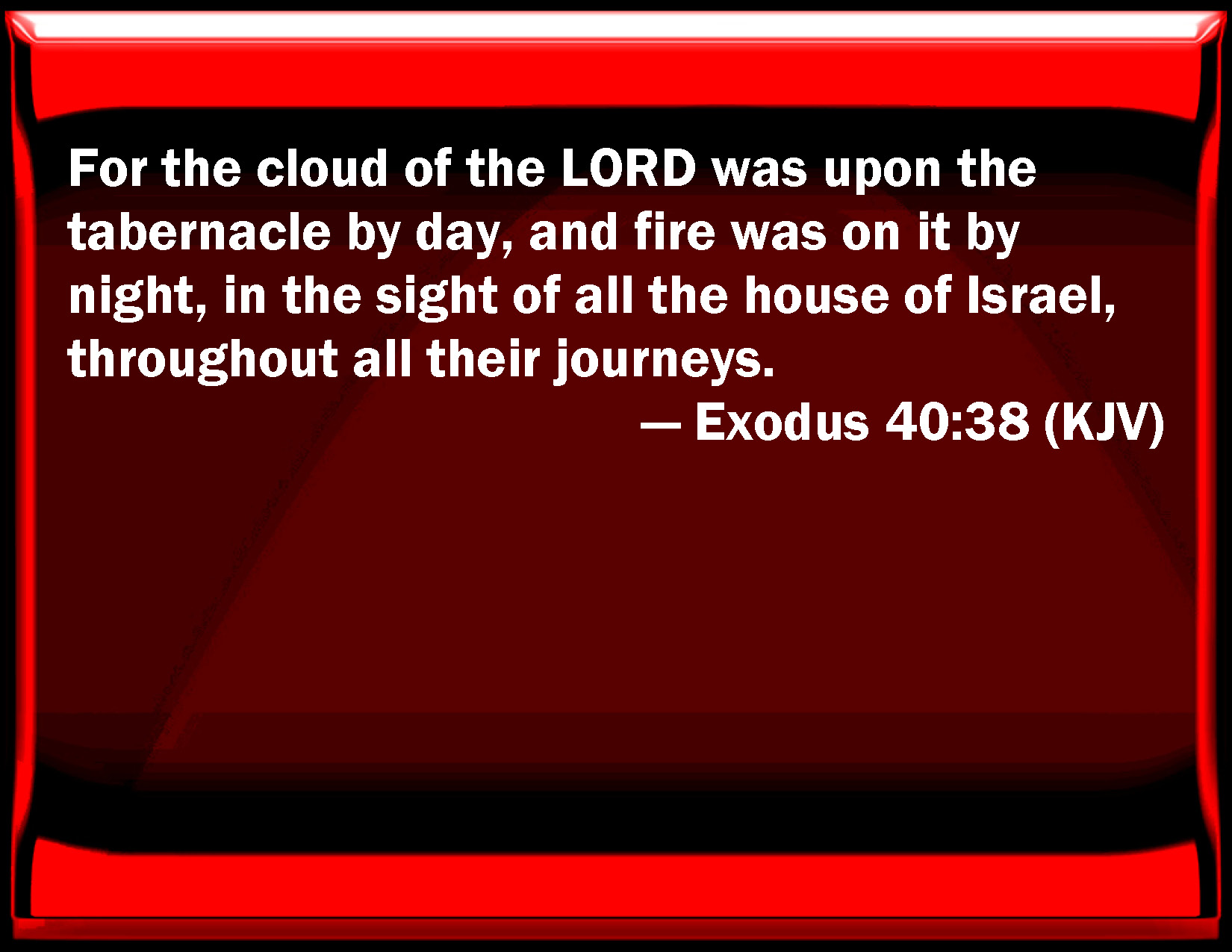 Bible Verse Slide Exodus 40:38 For the cloud of the LORD was on the tabernacle by day, and fire was on it by night, in the sight of all the house of Israel, throughout all their journeys. KJV: For the cloud of the LORD was upon the tabernacle by day, and fire was on it by night, in the sight of all the house of Israel, throughout all their journeys. DRB: For the cloud of the Lord hung over the tabernacle by day, and a fire by night, in the sight of all the children of Israel throughout all their mansions. DBT: For the cloud of Jehovah was on the tabernacle by day, and fire was in it by night, before the eyes of all the house of Israel, throughout all their journeys. ERV: For the cloud of the LORD was upon the tabernacle by day, and there was fire therein by night, in the sight of all the house of Israel, throughout all their journeys. WBT: For the cloud of the LORD was upon the tabernacle by day, and fire was on it by night, in the sight of all the house of Israel, throughout all their journeys. WEB: For the cloud of Yahweh was on the tabernacle by day, and there was fire in the cloud by night, in the sight of all the house of Israel, throughout all their journeys. YLT: for the cloud of Jehovah is on the tabernacle by day, and fire is in it by night, before the eyes of all the house of Israel in all their journeys.Links Exodus 40:38 NIV • Exodus 40:38 NLT • Exodus 40:38 ESV • Exodus 40:38 NASB • Exodus 40:38 KJV • Exodus 40:38 Interlinear • Exodus 40:38 Commentaries • Exodus 40:38 Parallel Texts • Exodus 40:38 Bible Apps • Exodus 40:38 Parallel • Bible Hub |