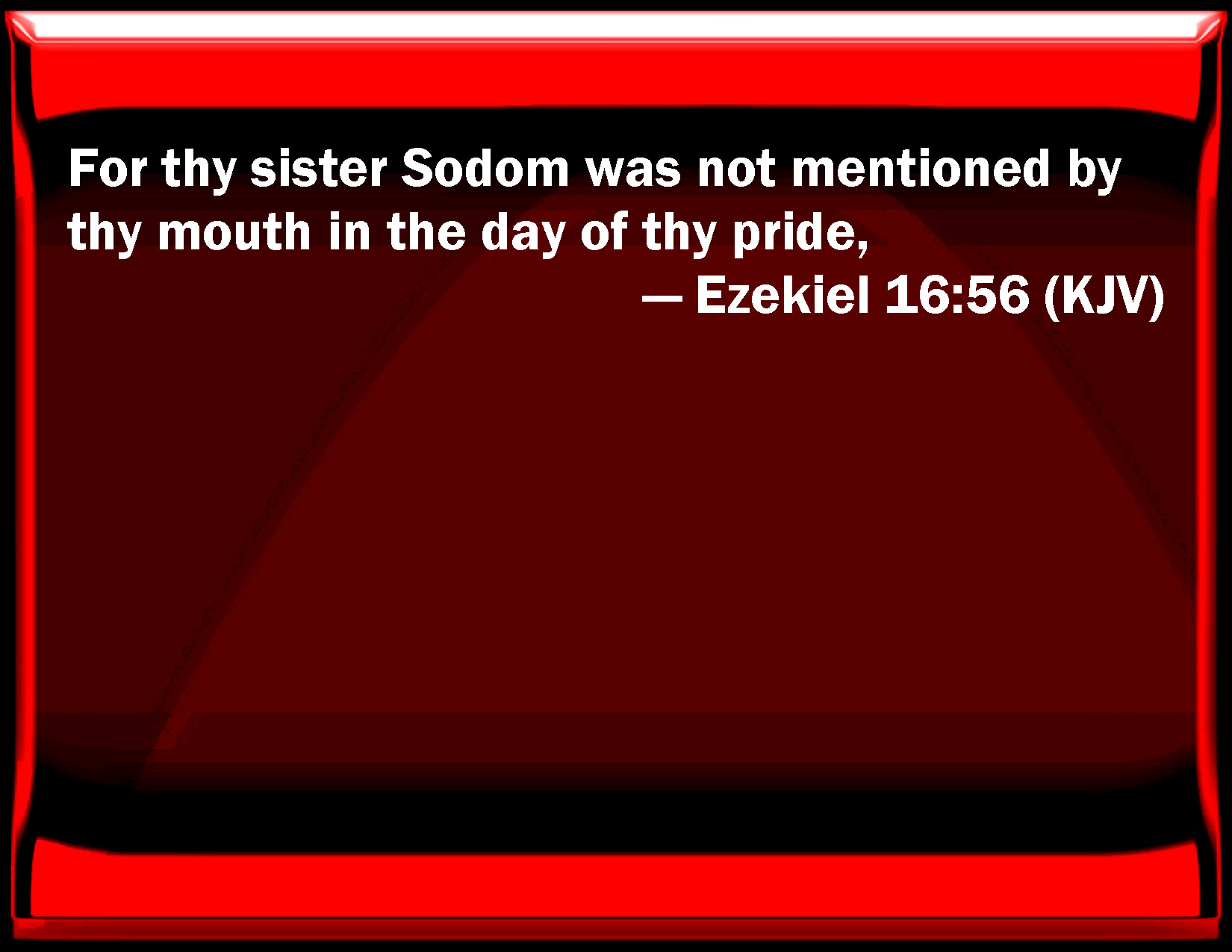Bible Verse Slide Ezekiel 16:56 For your sister Sodom was not mentioned by your mouth in the day of your pride, KJV: For thy sister Sodom was not mentioned by thy mouth in the day of thy pride, DRB: And Sodom thy sister was not heard of in thy mouth, in the day of thy pride, DBT: Yea, Sodom thy sister was not mentioned by thy mouth in the day of thy pride, ERV: For thy sister Sodom was not mentioned by thy mouth in the day of thy pride; WBT: For thy sister Sodom was not mentioned by thy mouth in the day of thy pride, WEB: For your sister Sodom was not mentioned by your mouth in the day of your pride, YLT: And thy sister Sodom hath not been for a report in thy mouth, In the day of thine arrogancy,Links Ezekiel 16:56 NIV • Ezekiel 16:56 NLT • Ezekiel 16:56 ESV • Ezekiel 16:56 NASB • Ezekiel 16:56 KJV • Ezekiel 16:56 Interlinear • Ezekiel 16:56 Commentaries • Ezekiel 16:56 Parallel Texts • Ezekiel 16:56 Bible Apps • Ezekiel 16:56 Parallel • Bible Hub |