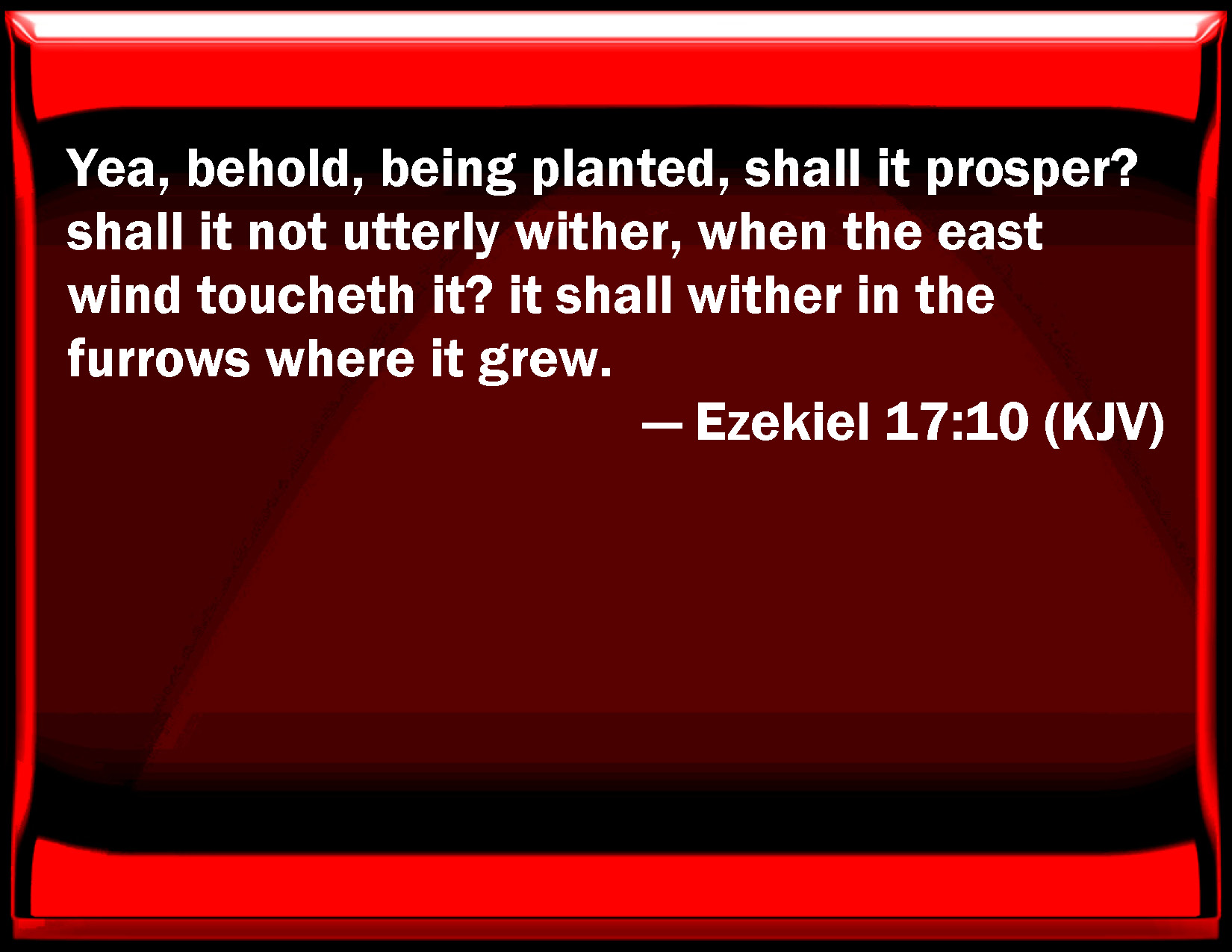 Bible Verse Slide Ezekiel 17:10 Yes, behold, being planted, shall it prosper? shall it not utterly wither, when the east wind touches it? it shall wither in the furrows where it grew. KJV: Yea, behold, being planted, shall it prosper? shall it not utterly wither, when the east wind toucheth it? it shall wither in the furrows where it grew. DRB: Behold, it is planted: shall it prosper then? shall it not be dried up when the burning wind shall touch it, and shall it not wither in the furrows where it grew? DBT: And behold, being planted, shall it prosper? shall it not utterly wither when the east wind toucheth it? It shall wither in the beds where it grew. ERV: Yea, behold, being planted, shall it prosper? shall it not utterly wither; when the east wind toucheth it? it shall wither in the beds where it grew. WBT: Yes, behold, being planted, shall it prosper? shall it not utterly wither, when the east wind toucheth it? it shall wither in the furrows where it grew. WEB: Yes, behold, being planted, shall it prosper? shall it not utterly wither, when the east wind touches it? it shall wither in the beds where it grew. YLT: And lo, the planted thing — doth it prosper? When come against it doth the east wind, Doth it not utterly wither? On the furrows of its springing it withereth.'Links Ezekiel 17:10 NIV • Ezekiel 17:10 NLT • Ezekiel 17:10 ESV • Ezekiel 17:10 NASB • Ezekiel 17:10 KJV • Ezekiel 17:10 Interlinear • Ezekiel 17:10 Commentaries • Ezekiel 17:10 Parallel Texts • Ezekiel 17:10 Bible Apps • Ezekiel 17:10 Parallel • Bible Hub |