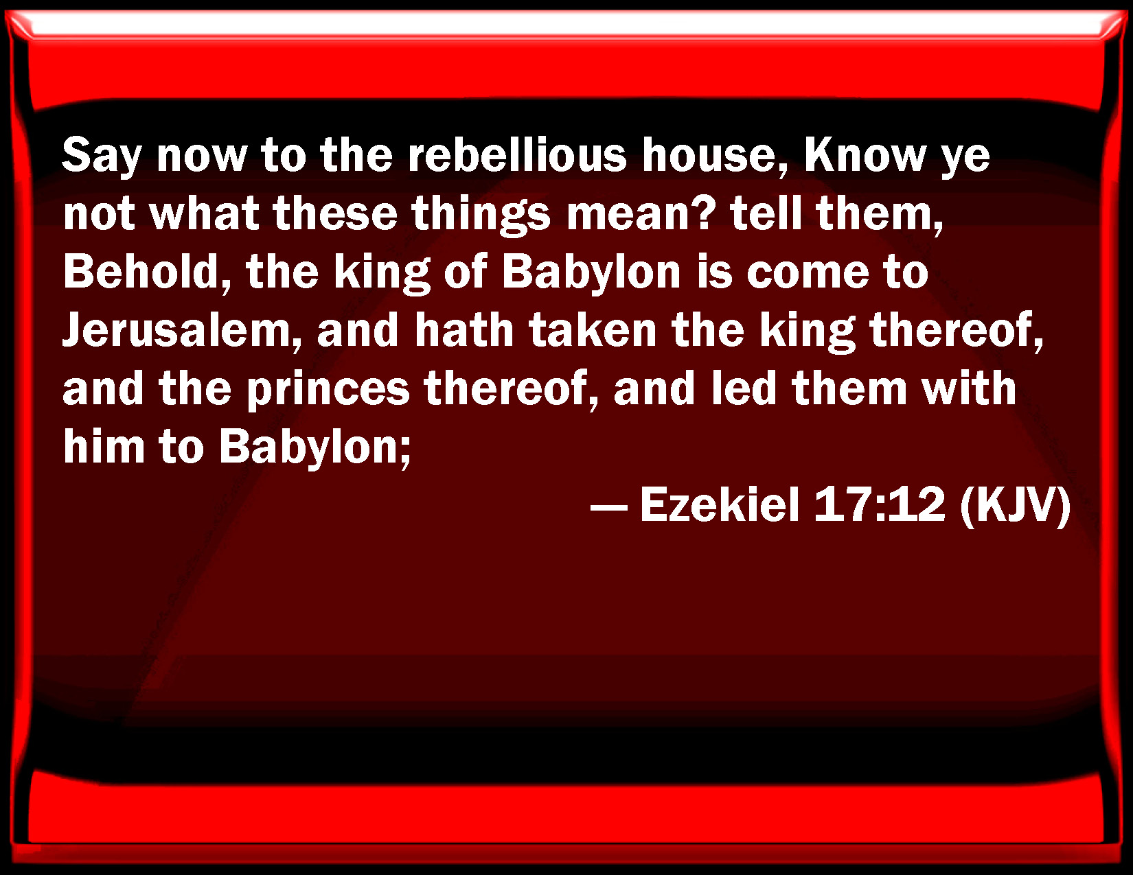 Bible Verse Slide Ezekiel 17:12 Say now to the rebellious house, Know you not what these things mean? tell them, Behold, the king of Babylon is come to Jerusalem, and has taken the king thereof, and the princes thereof, and led them with him to Babylon; KJV: Say now to the rebellious house, Know ye not what these things mean? tell them, Behold, the king of Babylon is come to Jerusalem, and hath taken the king thereof, and the princes thereof, and led them with him to Babylon; DRB: Say to the provoking house: Know you not what these things mean? Tell them: Behold the king of Babylon cometh to Jerusalem: and he shall take away the king and the princes thereof, and carry them with him to Babylon. DBT: Say now to the rebellious house, Know ye not what these things are? Say, Behold, the king of Babylon came to Jerusalem, and took its king and its princes, and led them with him to Babylon. ERV: Say now to the rebellious house, Know ye not what these things mean? tell them, Behold, the king of Babylon came to Jerusalem, and took the king thereof, and the princes thereof, and brought them to him to Babylon; WBT: Say now to the rebellious house, Know ye not what these things mean? tell them, Behold, the king of Babylon hath come to Jerusalem, and hath taken its king, and its princes, and led them with him to Babylon; WEB: Say now to the rebellious house, Don't you know what these things mean? tell them, Behold, the king of Babylon came to Jerusalem, and took its king, and its princes, and brought them to him to Babylon: YLT: Say, I pray thee, to the rebellious house, Have ye not known what these are? Say, Lo, come hath the king of Babylon to Jerusalem, And he taketh its king, and its princes, And bringeth them to himself to Babylon.Links Ezekiel 17:12 NIV • Ezekiel 17:12 NLT • Ezekiel 17:12 ESV • Ezekiel 17:12 NASB • Ezekiel 17:12 KJV • Ezekiel 17:12 Interlinear • Ezekiel 17:12 Commentaries • Ezekiel 17:12 Parallel Texts • Ezekiel 17:12 Bible Apps • Ezekiel 17:12 Parallel • Bible Hub |