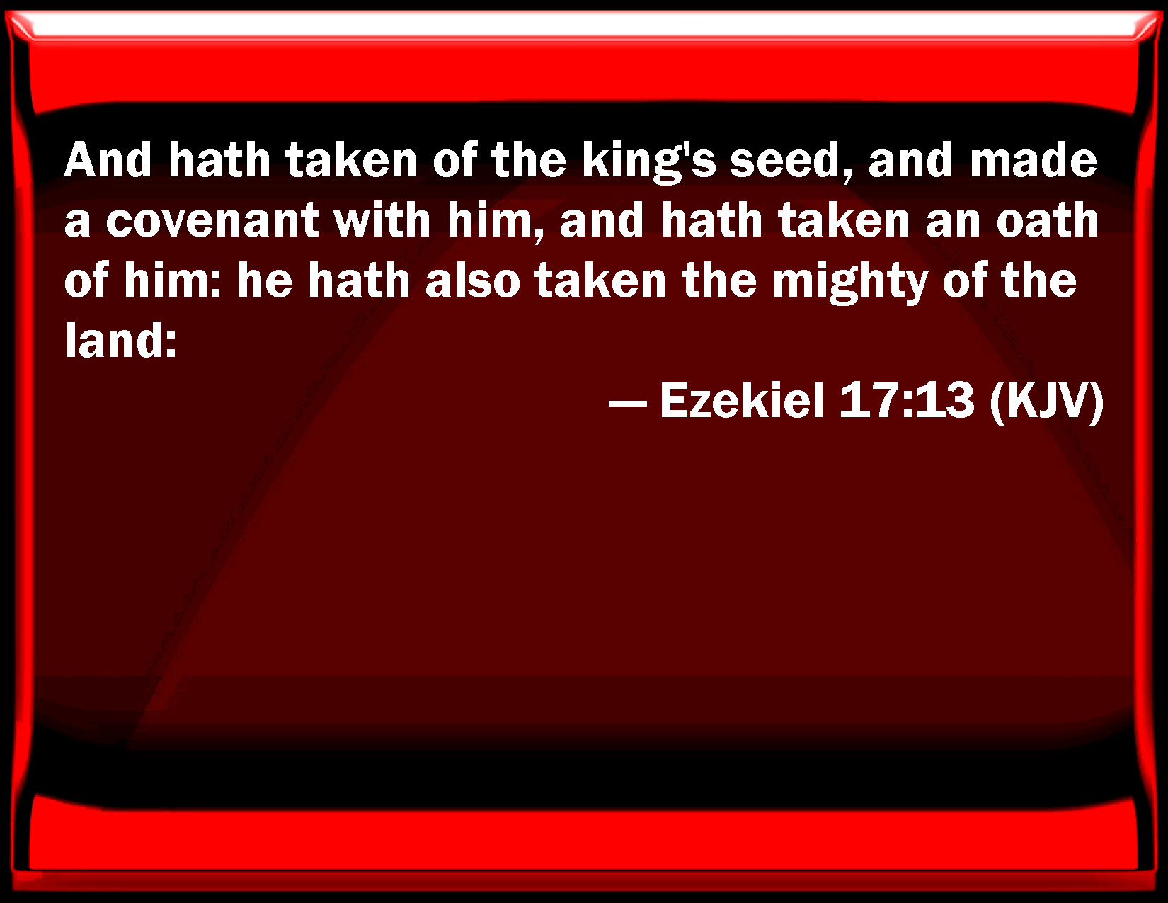 Bible Verse Slide Ezekiel 17:13 And has taken of the king's seed, and made a covenant with him, and has taken an oath of him: he has also taken the mighty of the land: KJV: And hath taken of the king's seed, and made a covenant with him, and hath taken an oath of him: he hath also taken the mighty of the land: DRB: And he shall take one of the king's seed, and make a covenant with him, and take an oath of him. Yea, and he shall take away the mighty men of the land, DBT: And he took of the king's seed, and made a covenant with him, and brought him under an oath, and he took away the mighty of the land; ERV: and he took of the seed royal, and made a covenant with him; he also brought him under an oath, and took away the mighty of the land: WBT: And hath taken of the king's seed, and made a covenant with him, and hath taken an oath from him: he hath also taken the mighty of the land: WEB: and he took of the seed royal, and made a covenant with him; he also brought him under an oath, and took away the mighty of the land; YLT: And he taketh of the seed of the kingdom, And maketh with him a covenant, And bringeth him in to an oath, And the mighty of the land he hath taken,Links Ezekiel 17:13 NIV • Ezekiel 17:13 NLT • Ezekiel 17:13 ESV • Ezekiel 17:13 NASB • Ezekiel 17:13 KJV • Ezekiel 17:13 Interlinear • Ezekiel 17:13 Commentaries • Ezekiel 17:13 Parallel Texts • Ezekiel 17:13 Bible Apps • Ezekiel 17:13 Parallel • Bible Hub |