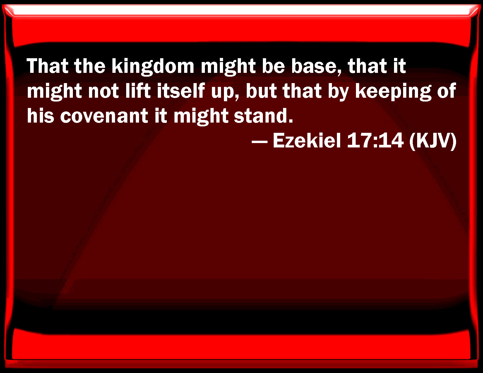 Bible Verse Slide Ezekiel 17:14 That the kingdom might be base, that it might not lift itself up, but that by keeping of his covenant it might stand. KJV: That the kingdom might be base, that it might not lift itself up, but that by keeping of his covenant it might stand. DRB: That it may be a low kingdom and not lift itself up, but keep his covenant, and observe it. DBT: that the kingdom might be abased, that it might not lift itself up, that it might keep his covenant in order to stand. ERV: that the kingdom might be base, that it might not lift itself up, but that by keeping of his covenant it might stand. WBT: That the kingdom might be base, that it might not lift itself up, but that by keeping his covenant it might stand. WEB: that the kingdom might be base, that it might not lift itself up, but that by keeping his covenant it might stand. YLT: That the kingdom may be humble, That it may not lift itself up, To keep his covenant — that it may stand.Links Ezekiel 17:14 NIV • Ezekiel 17:14 NLT • Ezekiel 17:14 ESV • Ezekiel 17:14 NASB • Ezekiel 17:14 KJV • Ezekiel 17:14 Interlinear • Ezekiel 17:14 Commentaries • Ezekiel 17:14 Parallel Texts • Ezekiel 17:14 Bible Apps • Ezekiel 17:14 Parallel • Bible Hub |
