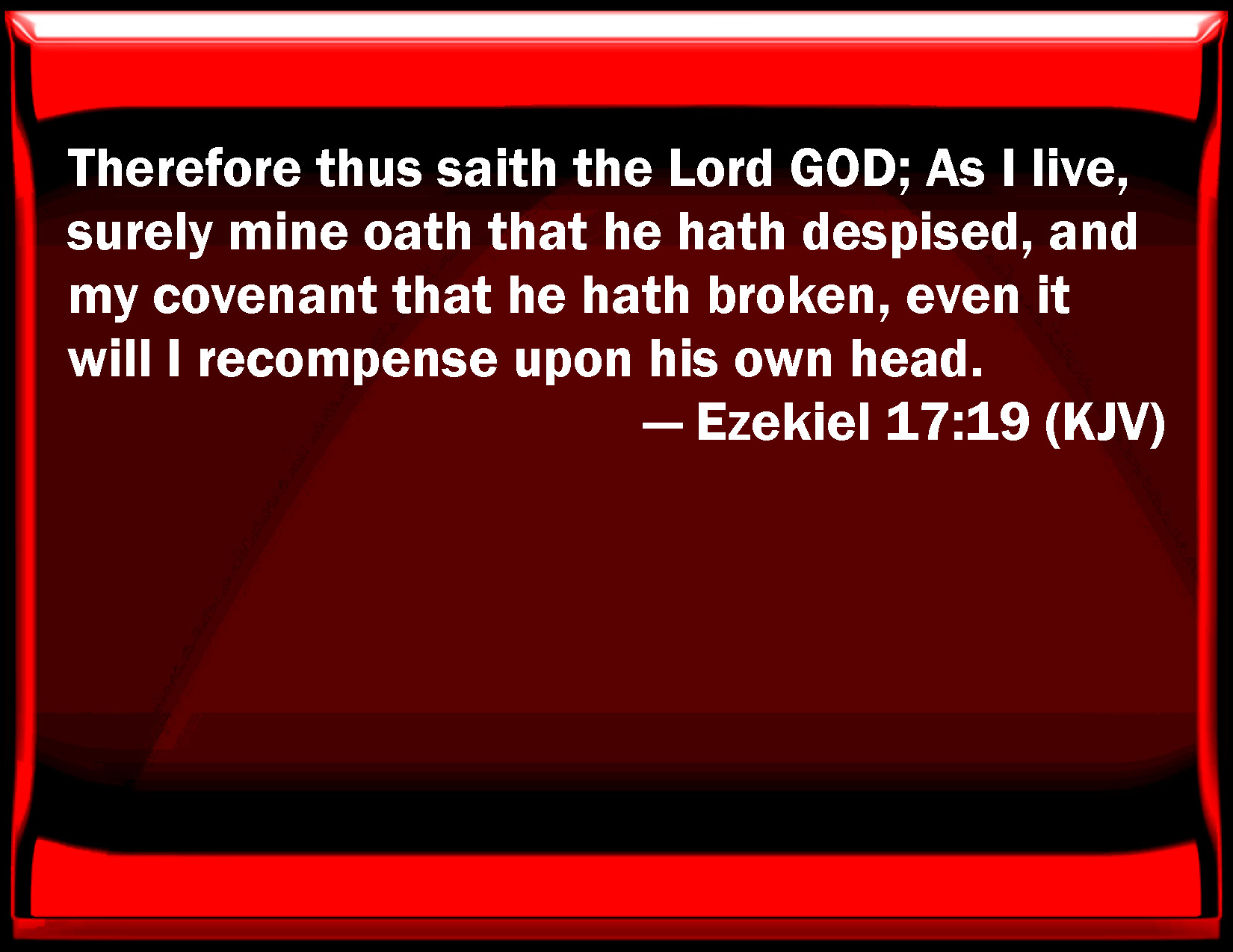 Bible Verse Slide Ezekiel 17:19 Therefore thus said the Lord GOD; As I live, surely my oath that he has despised, and my covenant that he has broken, even it will I recompense on his own head. KJV: Therefore thus saith the Lord GOD; As I live, surely mine oath that he hath despised, and my covenant that he hath broken, even it will I recompense upon his own head. DRB: Therefore thus saith the Lord God: As I live, I will lay upon his head the oath he hath despised, and the covenant he hath broken. DBT: Therefore thus saith the Lord Jehovah: As I live, verily, mine oath which he hath despised, and my covenant which he hath broken, even it will I recompense upon his head. ERV: Therefore thus saith the Lord GOD: As I live, surely mine oath that he hath despised, and my covenant that he hath broken, I will even bring it upon his own head. WBT: Therefore thus saith the Lord GOD; As I live, surely my oath that he hath despised, and my covenant that he hath broken, even that will I recompense upon his own head. WEB: Therefore thus says the Lord Yahweh: As I live, surely my oath that he has despised, and my covenant that he has broken, I will even bring it on his own head. YLT: Therefore, thus said the Lord Jehovah: I live — Mine oath that he hath despised, And My covenant that he hath broken, Have I not put it on his head?Links Ezekiel 17:19 NIV • Ezekiel 17:19 NLT • Ezekiel 17:19 ESV • Ezekiel 17:19 NASB • Ezekiel 17:19 KJV • Ezekiel 17:19 Interlinear • Ezekiel 17:19 Commentaries • Ezekiel 17:19 Parallel Texts • Ezekiel 17:19 Bible Apps • Ezekiel 17:19 Parallel • Bible Hub |