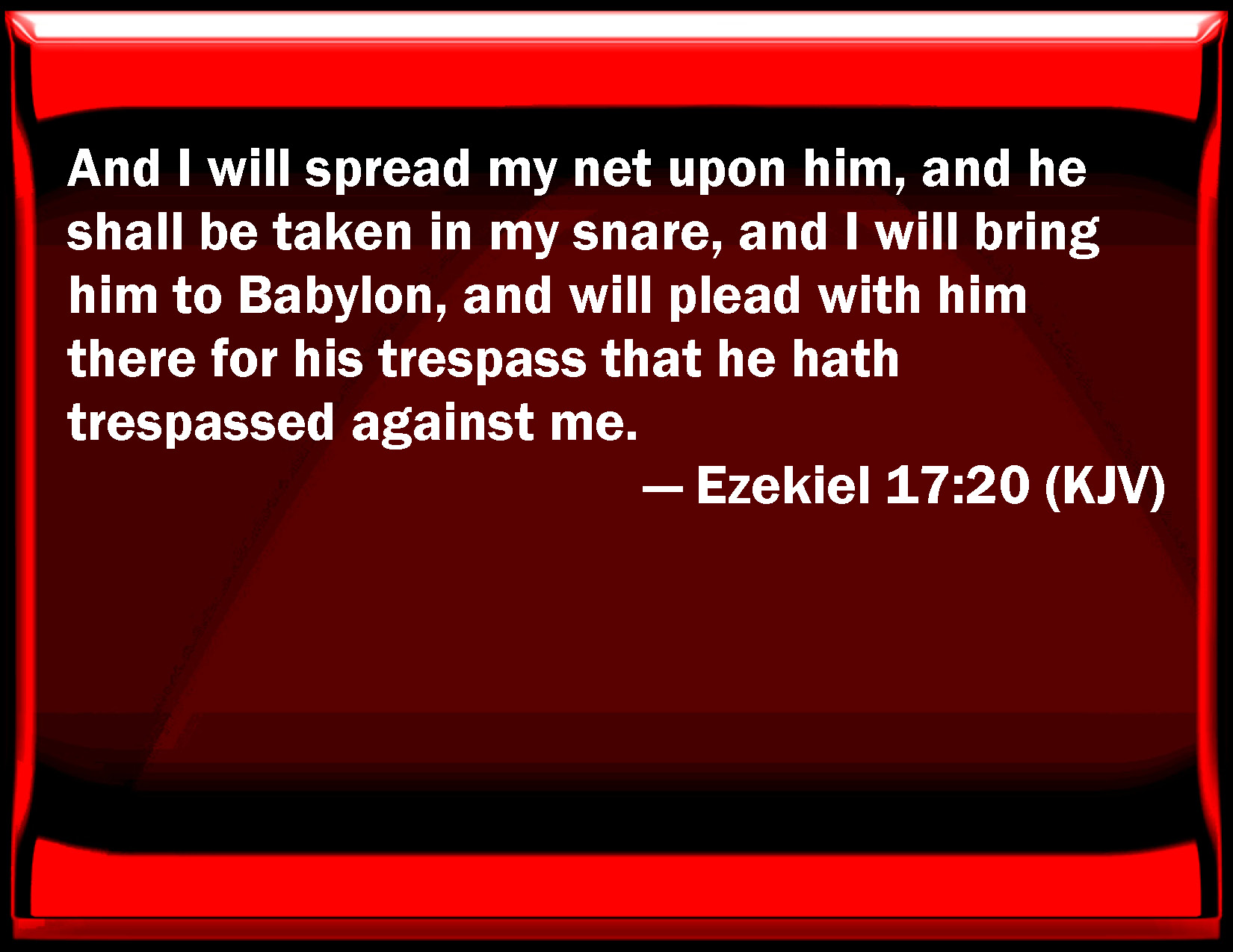 Bible Verse Slide Ezekiel 17:20 And I will spread my net on him, and he shall be taken in my snare, and I will bring him to Babylon, and will plead with him there for his trespass that he has trespassed against me. KJV: And I will spread my net upon him, and he shall be taken in my snare, and I will bring him to Babylon, and will plead with him there for his trespass that he hath trespassed against me. DRB: And I will spread my net over him, and he shall be taken in my net: and I will bring him into Babylon, and will judge him there for the transgression by which he hath despised me. DBT: And I will spread my net upon him, and he shall be taken in my snare; and I will bring him to Babylon, and will enter into judgment with him there for his unfaithfulness in which he hath been unfaithful against me. ERV: And I will spread my net upon him, and he shall be taken in my snare, and I will bring him to Babylon, and will plead with him there for his trespass that he hath trespassed against me. WBT: And I will spread my net upon him, and he shall be taken in my snare, and I will bring him to Babylon, and will plead with him there for his trespass that he hath trespassed against me. WEB: I will spread my net on him, and he shall be taken in my snare, and I will bring him to Babylon, and will enter into judgment with him there for his trespass that he has trespassed against me. YLT: And I have spread out for him My snare, And he hath been caught in My net, And I have brought him in to Babylon, And pleaded with him there his trespass, That he hath trespassed against Me.Links Ezekiel 17:20 NIV • Ezekiel 17:20 NLT • Ezekiel 17:20 ESV • Ezekiel 17:20 NASB • Ezekiel 17:20 KJV • Ezekiel 17:20 Interlinear • Ezekiel 17:20 Commentaries • Ezekiel 17:20 Parallel Texts • Ezekiel 17:20 Bible Apps • Ezekiel 17:20 Parallel • Bible Hub |