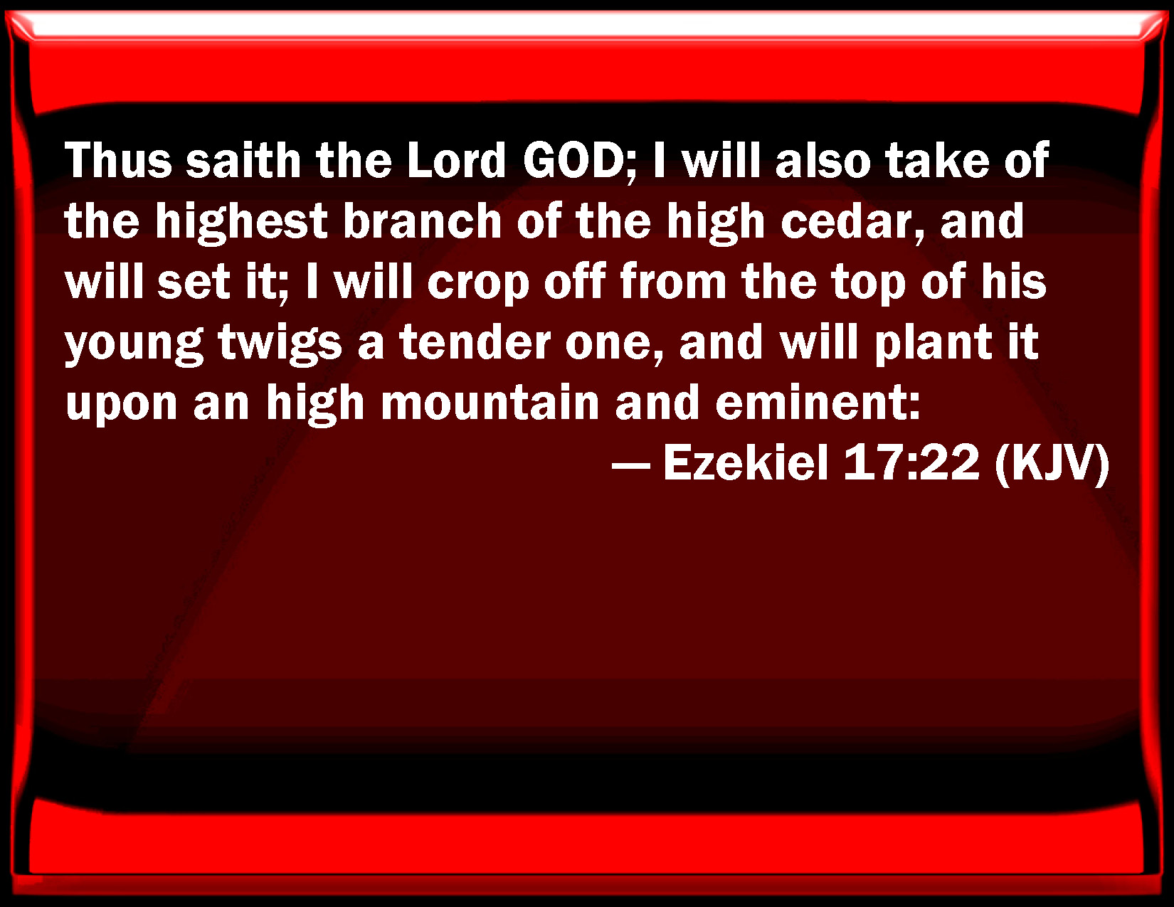 Bible Verse Slide Ezekiel 17:22 Thus said the Lord GOD; I will also take of the highest branch of the high cedar, and will set it; I will crop off from the top of his young twigs a tender one, and will plant it on an high mountain and eminent: KJV: Thus saith the Lord GOD; I will also take of the highest branch of the high cedar, and will set it; I will crop off from the top of his young twigs a tender one, and will plant it upon an high mountain and eminent: DRB: Thus saith the Lord God: I myself will take of the marrow of the high cedar, and will set it: I will crop off a tender twig from the top of the branches thereof, and I will plant it on a mountain high and eminent. DBT: Thus saith the Lord Jehovah: I will also take of the highest branch of the lofty cedar, and will set it; I will crop off from the top of its young shoots a tender one, and I will plant it upon a high and eminent mountain: ERV: Thus saith the Lord GOD: I will also take of the lofty top of the cedar, and will set it; I will crop off from the topmost of his young twigs a tender one, and I will plant it upon an high mountain and eminent: WBT: Thus saith the Lord GOD, I will also take of the highest branch of the high cedar, and will set it; I will crop off from the top of its young twigs a tender one, and will plant it upon a high mountain and eminent: WEB: Thus says the Lord Yahweh: I will also take of the lofty top of the cedar, and will set it; I will crop off from the topmost of its young twigs a tender one, and I will plant it on a high and lofty mountain: YLT: Thus said the Lord Jehovah: I have taken of the foliage of the high cedar, And I have set it, From the top of its tender shoots a tender one I crop, And I — I have planted it on a mountain high and lofty.Links Ezekiel 17:22 NIV • Ezekiel 17:22 NLT • Ezekiel 17:22 ESV • Ezekiel 17:22 NASB • Ezekiel 17:22 KJV • Ezekiel 17:22 Interlinear • Ezekiel 17:22 Commentaries • Ezekiel 17:22 Parallel Texts • Ezekiel 17:22 Bible Apps • Ezekiel 17:22 Parallel • Bible Hub |