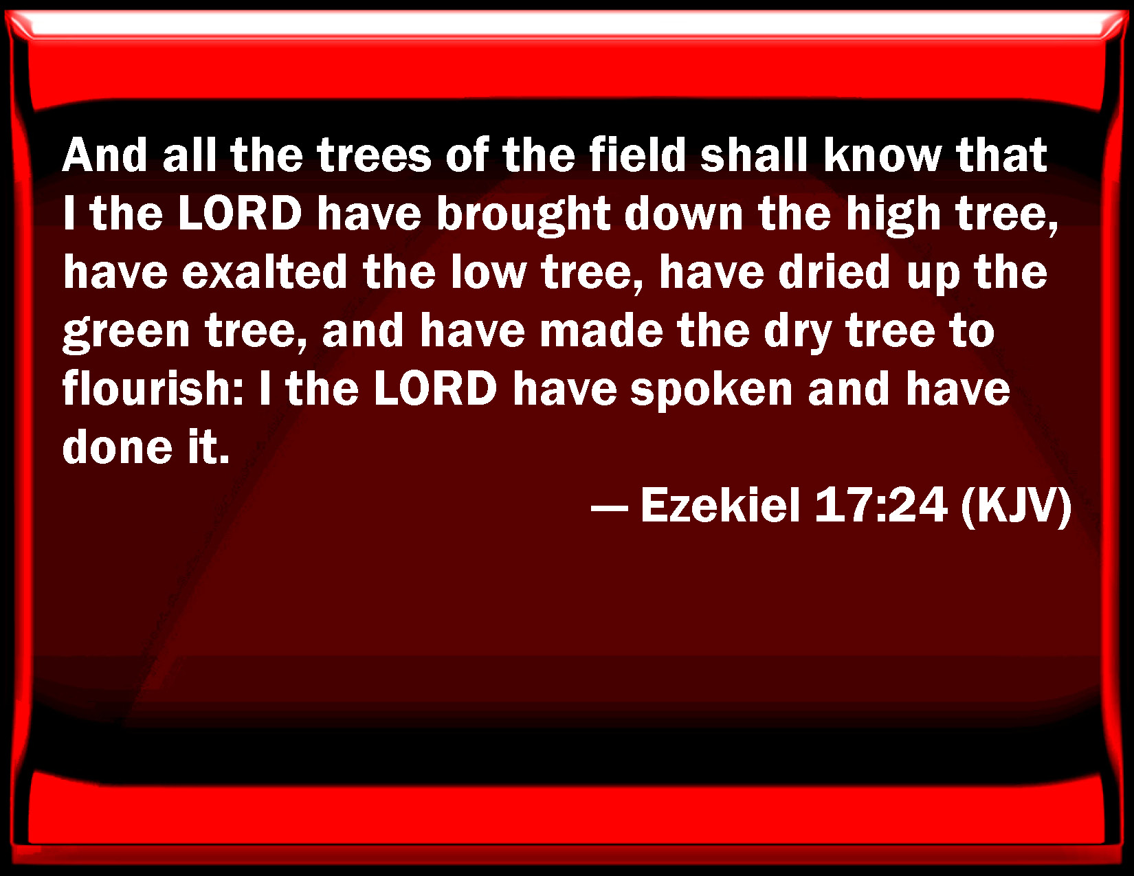Bible Verse Slide Ezekiel 17:24 And all the trees of the field shall know that I the LORD have brought down the high tree, have exalted the low tree, have dried up the green tree, and have made the dry tree to flourish: I the LORD have spoken and have done it. KJV: And all the trees of the field shall know that I the LORD have brought down the high tree, have exalted the low tree, have dried up the green tree, and have made the dry tree to flourish: I the LORD have spoken and have done it. DRB: And all the trees of the country shall know that I the Lord have brought down the high tree, and exalted the low tree: and have dried up the green tree, and have caused the dry tree to flourish. I the Lord have spoken and have done it. DBT: And all the trees of the field shall know that I Jehovah have brought down the high tree, have exalted the low tree, have dried up the green tree, and made the dry tree to flourish: I Jehovah have spoken, and will do it. ERV: And all the trees of the field shall know that I the LORD have brought down the high tree, have exalted the low tree, have dried up the green tree, and have made the dry tree to flourish: I the LORD have spoken and have done it. WBT: And all the trees of the field shall know that I the LORD have brought down the high tree, have exalted the low tree, have dried up the green tree, and have made the dry tree to flourish: I the LORD have spoken and have done it. WEB: All the trees of the field shall know that I, Yahweh, have brought down the high tree, have exalted the low tree, have dried up the green tree, and have made the dry tree to flourish; I, Yahweh, have spoken and have done it. YLT: And known have all trees of the field That I, Jehovah, have made low the high tree, I have set on high the low tree, I have dried up the moist tree, And I have caused the dry tree to flourish, I, Jehovah, have spoken, and have done it!'Links Ezekiel 17:24 NIV • Ezekiel 17:24 NLT • Ezekiel 17:24 ESV • Ezekiel 17:24 NASB • Ezekiel 17:24 KJV • Ezekiel 17:24 Interlinear • Ezekiel 17:24 Commentaries • Ezekiel 17:24 Parallel Texts • Ezekiel 17:24 Bible Apps • Ezekiel 17:24 Parallel • Bible Hub |