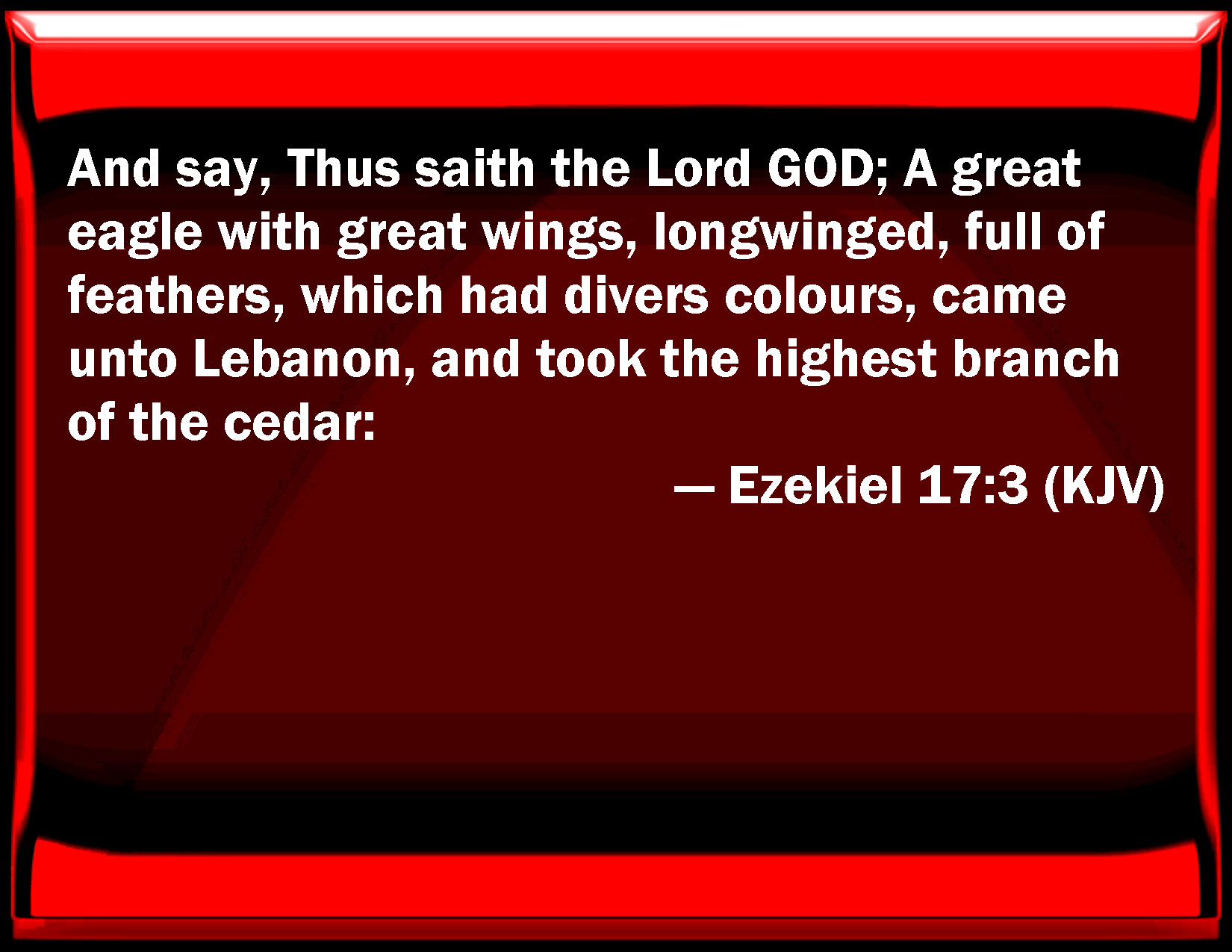 Bible Verse Slide Ezekiel 17:3 And say, Thus said the Lord GOD; A great eagle with great wings, long winged, full of feathers, which had divers colors, came to Lebanon, and took the highest branch of the cedar: KJV: And say, Thus saith the Lord GOD; A great eagle with great wings, longwinged, full of feathers, which had divers colours, came unto Lebanon, and took the highest branch of the cedar: DRB: And say: Thus saith the Lord God: A large eagle with great wings, long-limbed, full of feathers, and of variety, came to Libanus, and took away the marrow of the cedar. DBT: and say, Thus saith the Lord Jehovah: A great eagle with great wings, long-pinioned, full of feathers, which was of divers colours, came unto Lebanon, and took the highest branch of the cedar. ERV: and say, Thus saith the Lord GOD: A great eagle with great wings and long pinions, full of feathers, which had divers colours, came unto Lebanon, and took the top of the cedar: WBT: And say, Thus saith the Lord GOD; A great eagle with great wings, long-winged, full of feathers, which had divers colors, came to Lebanon, and took the highest branch of the cedar: WEB: and say, Thus says the Lord Yahweh: A great eagle with great wings and long feathers, full of feathers, which had various colors, came to Lebanon, and took the top of the cedar: YLT: and thou hast said: Thus said the Lord Jehovah: The great eagle, great-winged, long-pinioned, Full of feathers, that hath diverse colours, Hath come in unto Lebanon, And it taketh the foliage of the cedar,Links Ezekiel 17:3 NIV • Ezekiel 17:3 NLT • Ezekiel 17:3 ESV • Ezekiel 17:3 NASB • Ezekiel 17:3 KJV • Ezekiel 17:3 Interlinear • Ezekiel 17:3 Commentaries • Ezekiel 17:3 Parallel Texts • Ezekiel 17:3 Bible Apps • Ezekiel 17:3 Parallel • Bible Hub |