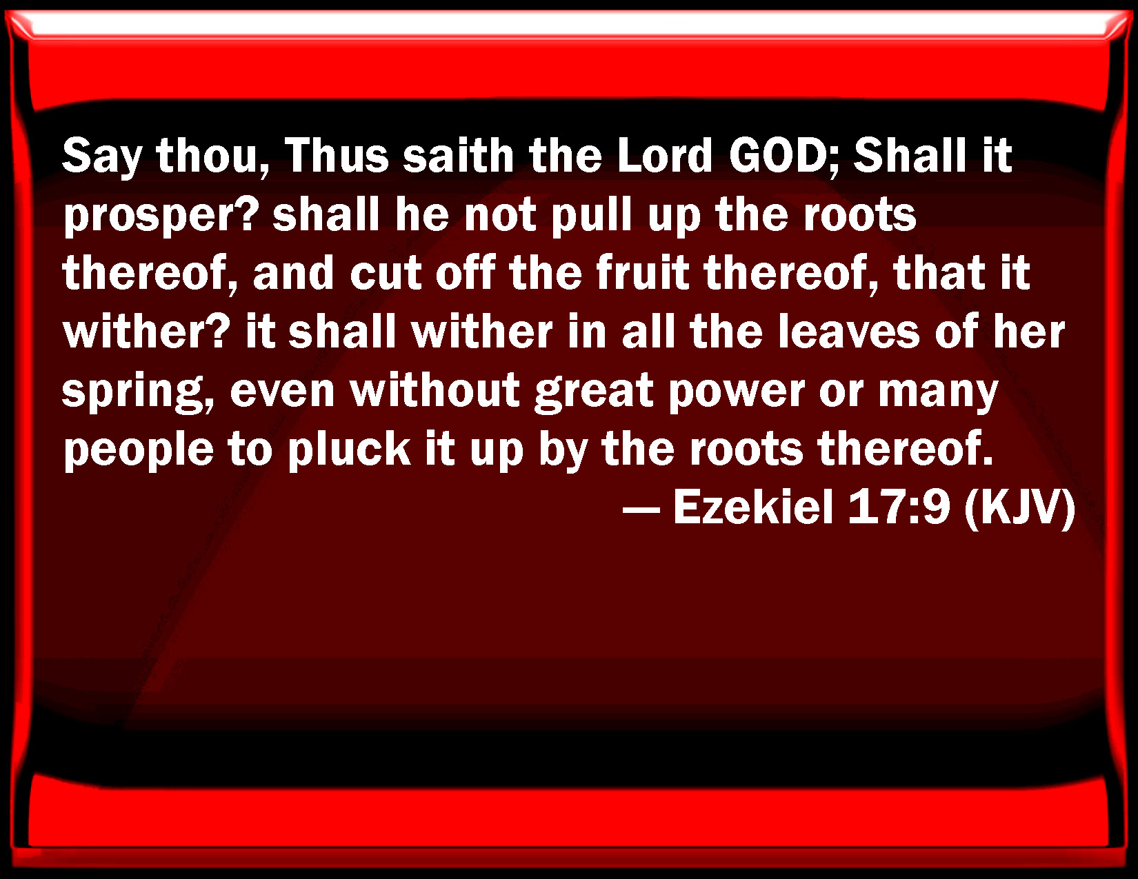 Bible Verse Slide Ezekiel 17:9 Say you, Thus said the Lord GOD; Shall it prosper? shall he not pull up the roots thereof, and cut off the fruit thereof, that it wither? it shall wither in all the leaves of her spring, even without great power or many people to pluck it up by the roots thereof. KJV: Say thou, Thus saith the Lord GOD; Shall it prosper? shall he not pull up the roots thereof, and cut off the fruit thereof, that it wither? it shall wither in all the leaves of her spring, even without great power or many people to pluck it up by the roots thereof. DRB: Say thou: Thus saith the Lord God: Shall it prosper then? shall he not pull up the roots thereof, and strip off its fruit, and dry up all the branches it hath shot forth, and make it wither: and this without a strong arm, or many people, to pluck it up by the root? DBT: Say, Thus saith the Lord Jehovah: Shall it prosper? Shall he not pull up its roots, and cut off its fruit, that it may wither? All its fresh sprouting leaves shall wither, even without a great arm and many people to pluck it up by its roots. ERV: Say thou, Thus saith the Lord GOD: Shall it prosper? shall he not pull up the roots thereof, and cut off the fruit thereof, that it may wither; that all its fresh springing leaves may wither; even without great power or much people to pluck it up by the roots thereof? WBT: Say thou, Thus saith the Lord GOD; Shall it prosper? shall he not pull up its roots, and cut off its fruit, that it may wither? it shall wither in all the leaves of her spring, even without great power or many people to pluck it up by its roots. WEB: Say, Thus says the Lord Yahweh: Shall it prosper? shall he not pull up its roots, and cut off its fruit, that it may wither; that all its fresh springing leaves may wither? and not by a strong arm or many people can it be raised from its roots. YLT: Say: Thus said the Lord Jehovah: It prospereth — its roots doth he not draw out, And its fruit cut off, and it is withered? In all the leaves of its springing it withereth, And not by great strength, and by a numerous people, To lift it up by its roots.Links Ezekiel 17:9 NIV • Ezekiel 17:9 NLT • Ezekiel 17:9 ESV • Ezekiel 17:9 NASB • Ezekiel 17:9 KJV • Ezekiel 17:9 Interlinear • Ezekiel 17:9 Commentaries • Ezekiel 17:9 Parallel Texts • Ezekiel 17:9 Bible Apps • Ezekiel 17:9 Parallel • Bible Hub |